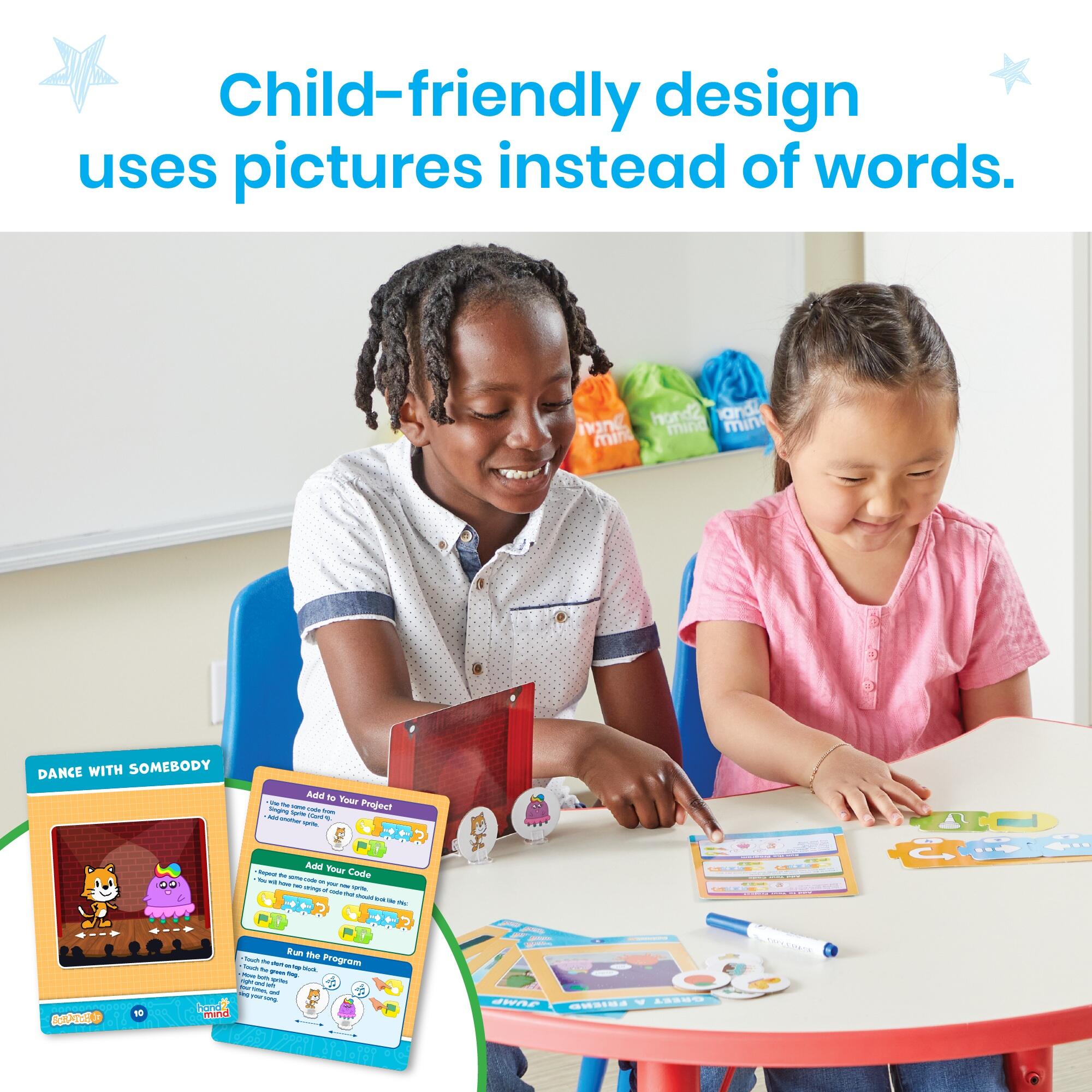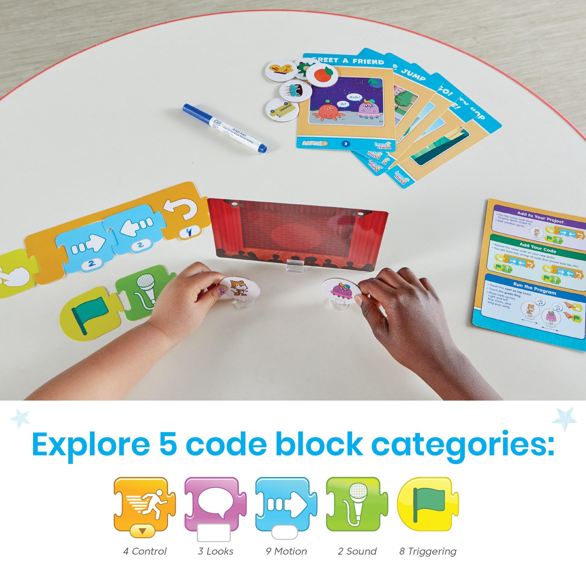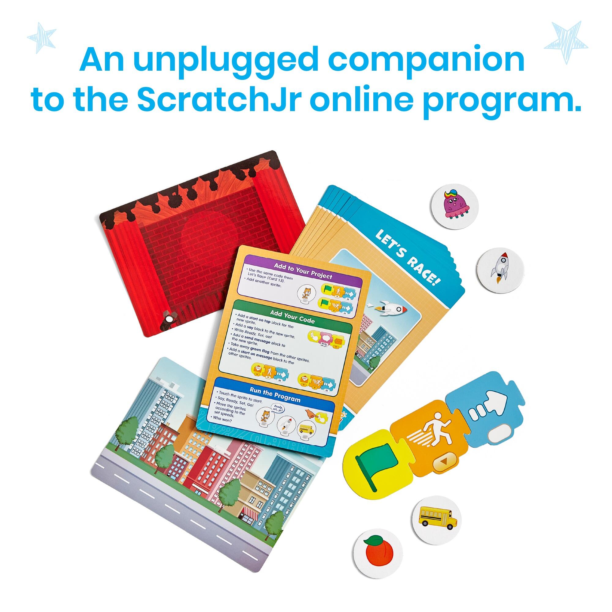Unplug and explore coding with a hands-on companion to the ScratchJr app. Designed with young learners in mind, this screen-free set uses child-friendly blocks with pictures instead of words, perfect for early coders. Students complete 16 challenges that help them plan coding sequences, build scripts, and test outcomes using colorful blocks, sprites, and backdrops. With block types like Motion, Looks, Sound, Triggering, and Control, they'll learn the basics of programming while sparking creativity in every block they put together. ScratchJr is part of the Scratch Foundation and was originally developed by Prof. Mitchel Resnick and his Lifelong Kindergarten group at the MIT Media Lab and Prof. Marina U. Bers and her DevTech Research Group. The ScratchJr app is available for free on the App Store, Google Play, and Amazon Marketplace. You can learn more about ScratchJr at www.scratchjr.org.