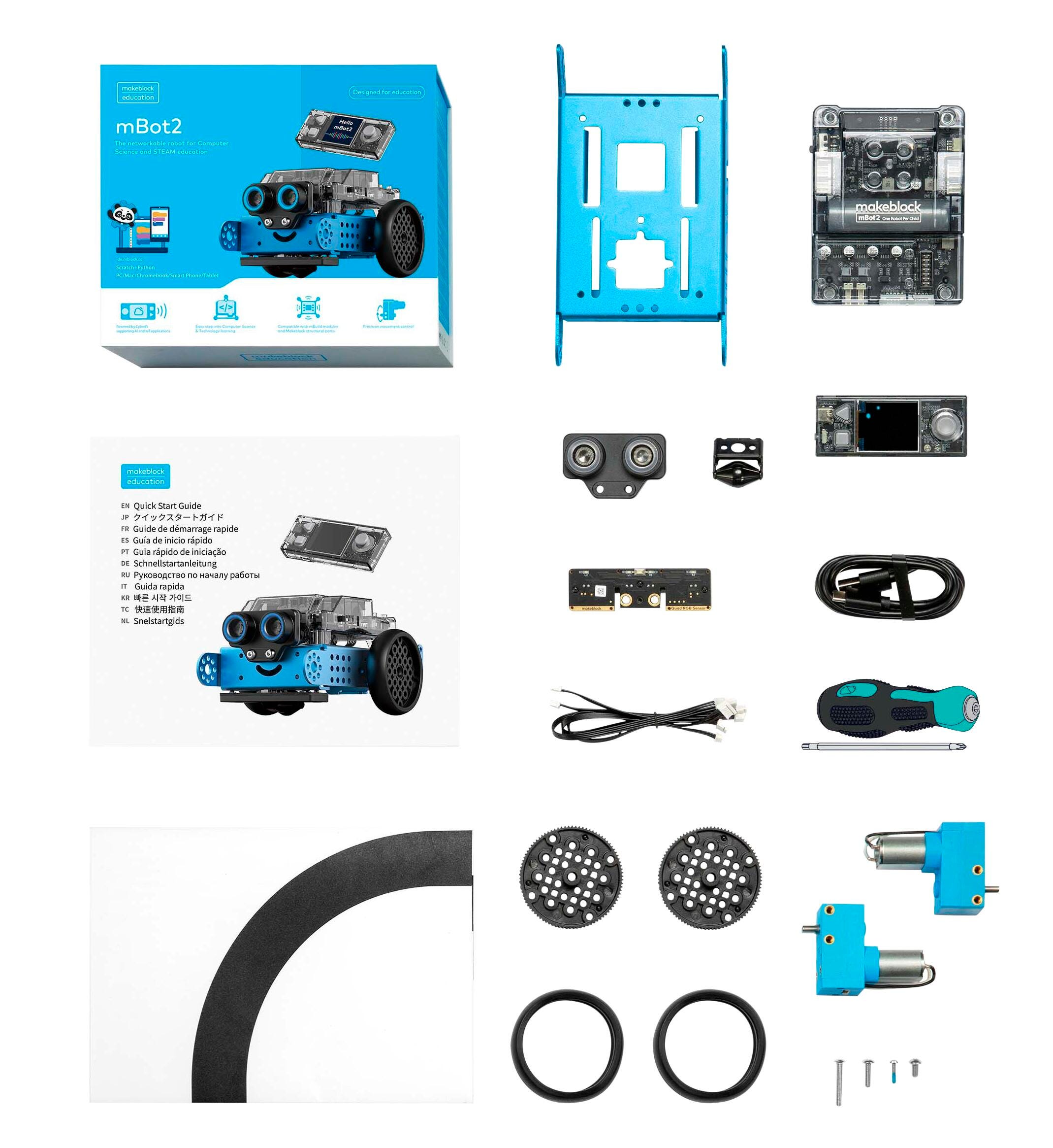 The mBot2 by Makeblock is a comprehensive robot kit designed for robotics and coding education. mBot2 is powered by CyberPi, an educational microcontroller enhanced with network capabilities, built-in sensors, and much more. mBot2 is designed for students to carry out interactive and smart lessons that are engaging, fun, and reflect real-world applications with cutting-edge technologies, including robotics, AI, IoT, and Data Science. With mBlock’s enhanced coding learning experience, mBot2 allows students and educators to begin with the block-based coding approach, and seamlessly transition into object-oriented coding with Python, all in the same environment.Features