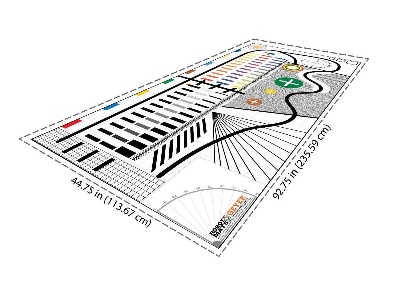 This robotics mat contains every element present in a variety of challenges. Features include varying types of lines, counting blocks in widths and contrasts, a variety of targets, interfering backgrounds, side blocks, aiming compasses, and a 70-inch ruler (in US and Metric). Teaches skills such as line following, color sensing, turning, and more. Ideal for a quick and quality solution for teaching students robotics and coding. Easy to use on the floor or on a table, you no longer need to create your own course or place electrical tape on the floor. General practice mat ideas include: basic drive straight, basic accurate turns, combined straight and turn, basic line counting, and light/color sensor. The mat measures 44-3/4 W x 92-3/4 L inches.Features