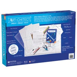 Users learn real drafting skills as they build 3-D designs from the ground up. This introduction to architecture sparks the imagination as kids use real architectural tools like a drafting triangle, compass and more to design, furnish and decorate floor plans using the detailed guidebook, static-cling doors and windows, furniture templates, drafting paper, 18 x 24 inch acrylic work surface, art supplies and more.Features