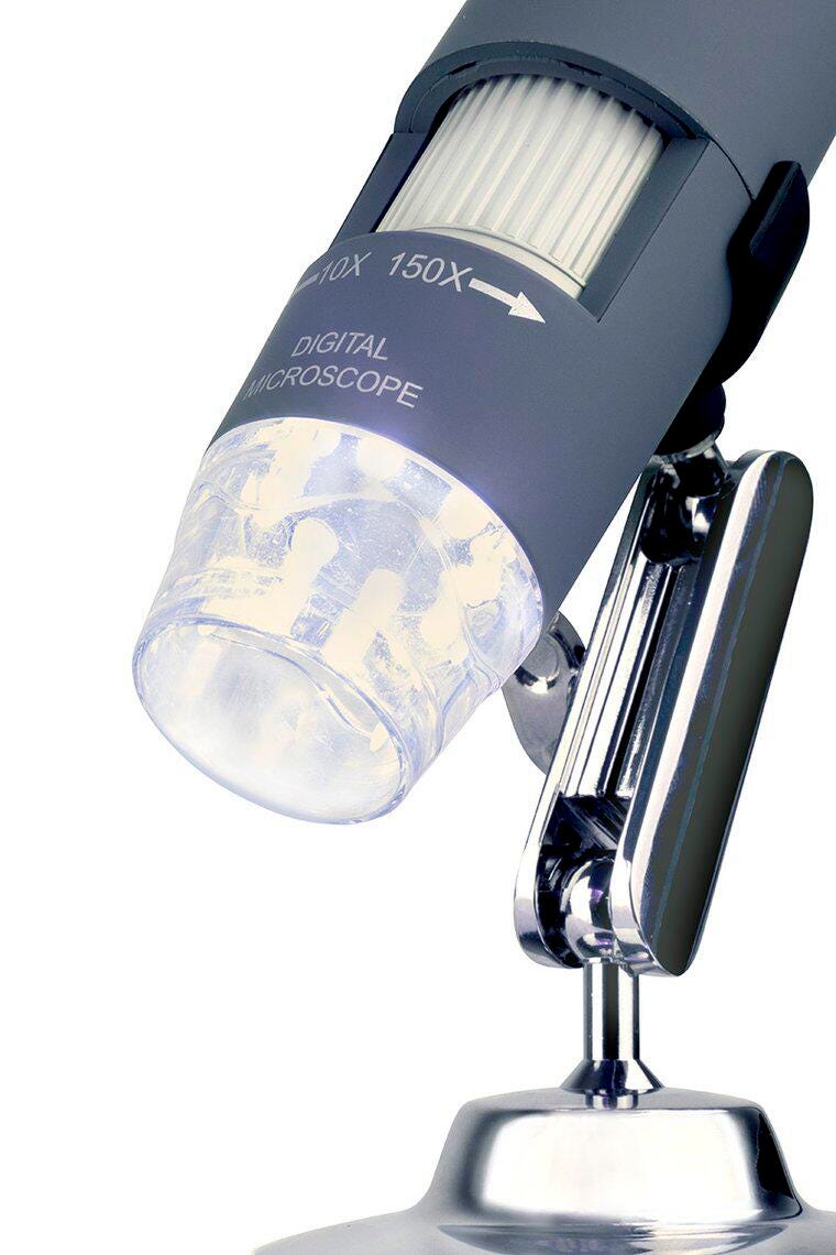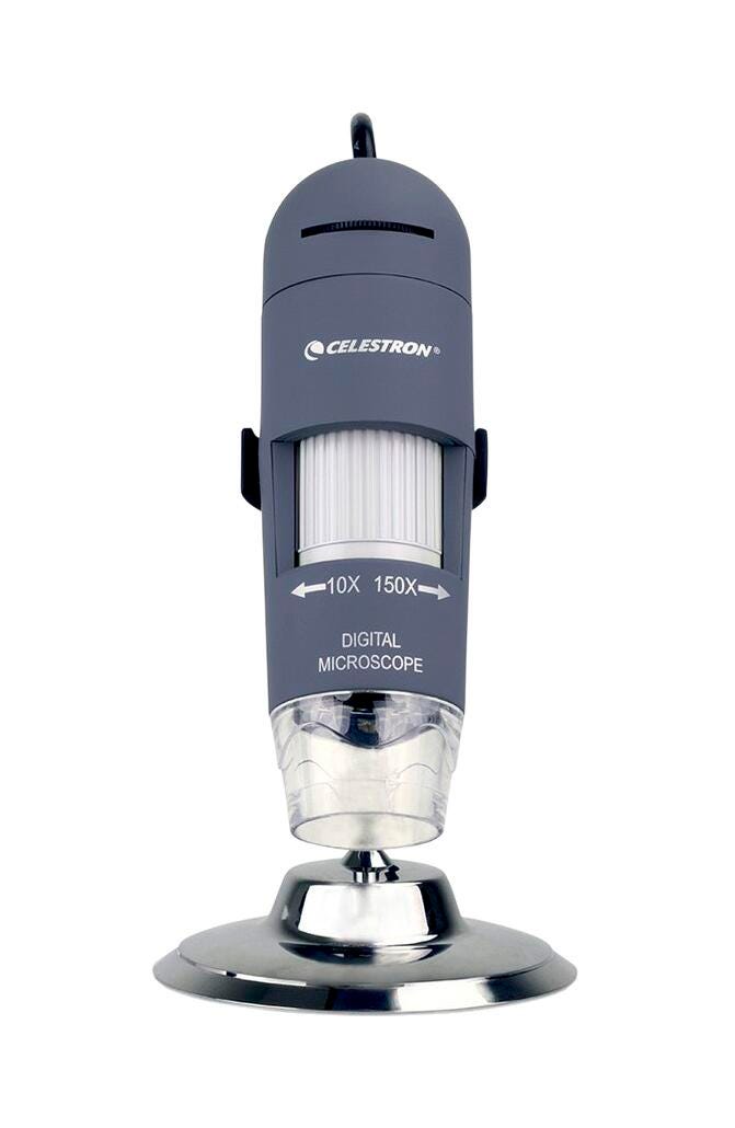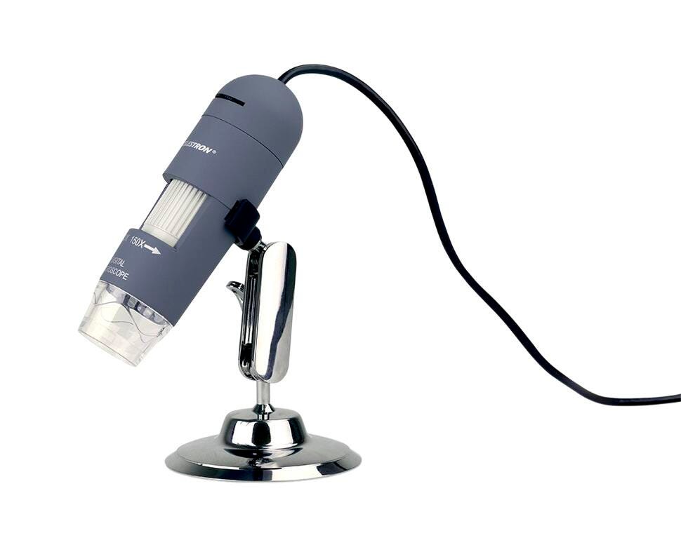 The intermediate-level Celestron Deluxe Handheld Digital Microscope is an easy to use, low power microscope. With powers of 10x to 150x, it’s ideal for viewing stamps, coins, bugs, plants, rocks, skin, gems, circuit boards, and more. With the higher power magnifications, you can even view traditional microscope slides. Best of all, it comes with a built-in 2MP digital camera for capturing images and video with MicroCapture Pro Software Included. Image captures up to 1920 X 1080 pixels to view your subject with clarity even on large monitors. The LED illuminator ensures your specimens are clear and bright. An included metal stand allows for steady shots and comes in handy when viewing at higher powers, minimizing shaking and keeping your specimen in sharp focus. For teens and adults alike, the Deluxe Handheld Digital Microscope is a fun, educational tool. It’s well suited for hobbyists, quality control inspectors, medical professionals, and scientific researchers.Features
