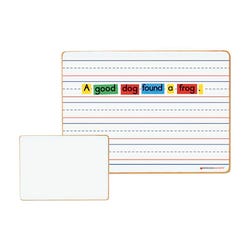 This letter and magnets set lets young learners make a magnet sentence, practice sentence construction, parts of speech, related writing concepts, punctuation, and more. The line-ruled side is perfect for handwriting practice, story writing, sentence construction, and beyond. Each board measures 12 x 8-3/4 inches. Appropriate for ages 5 and up or Grades PreK and up.Features