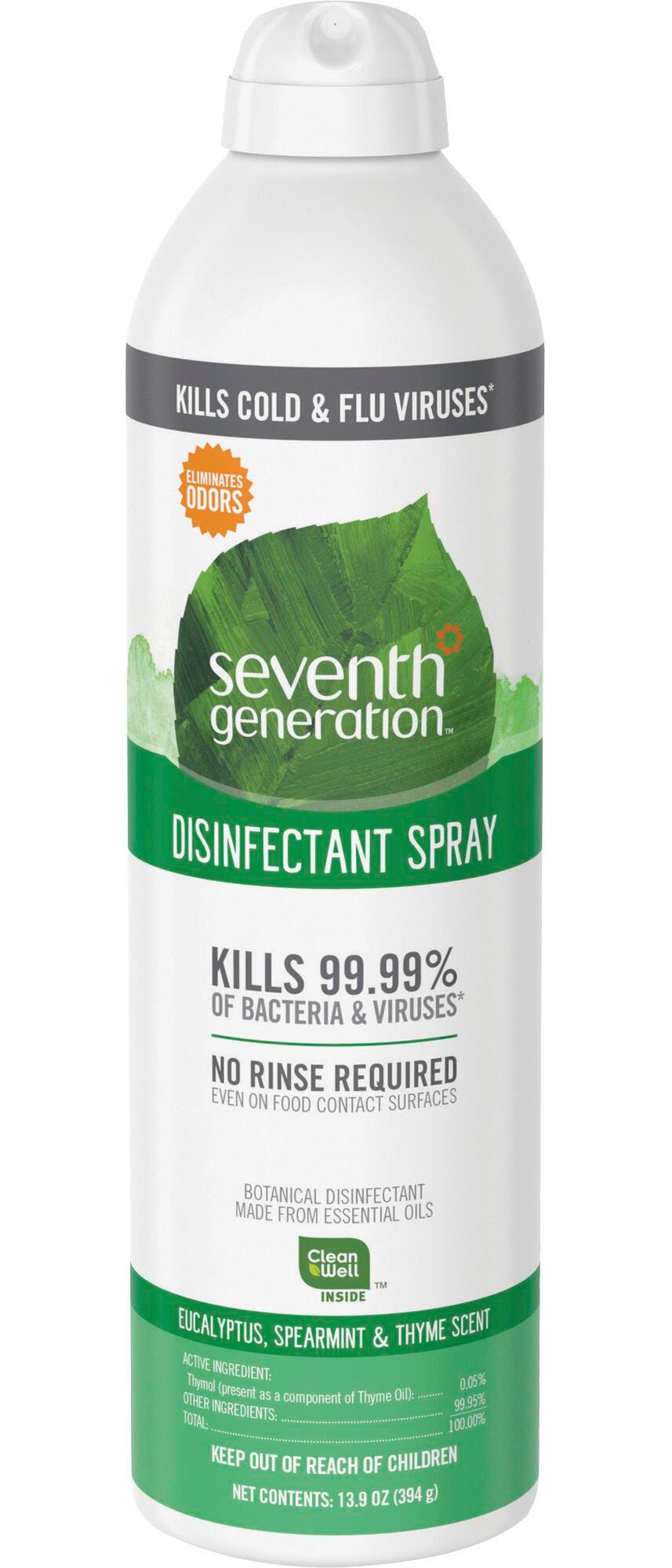 The Seventh Generation Botanical Disinfectant Spray features an active ingredient that's made from essential oils to kill 99.99 percent of bacteria and viruses without the use of harsh solvents. Its gentle formula does not require you to rinse surfaces even when cleaning food contact surfaces for quick, simple cleanings. Plus, special odor eliminators seek out unpleasant smells to leave rooms smelling freshly cleaned. Bag-on-valve technology uses a nonflammable, compressed air propellant for safe use by you and for our environment. Disinfectant spray is perfect for use in offices, daycare centers, restaurants, schools and more. Case of 8.Includes: