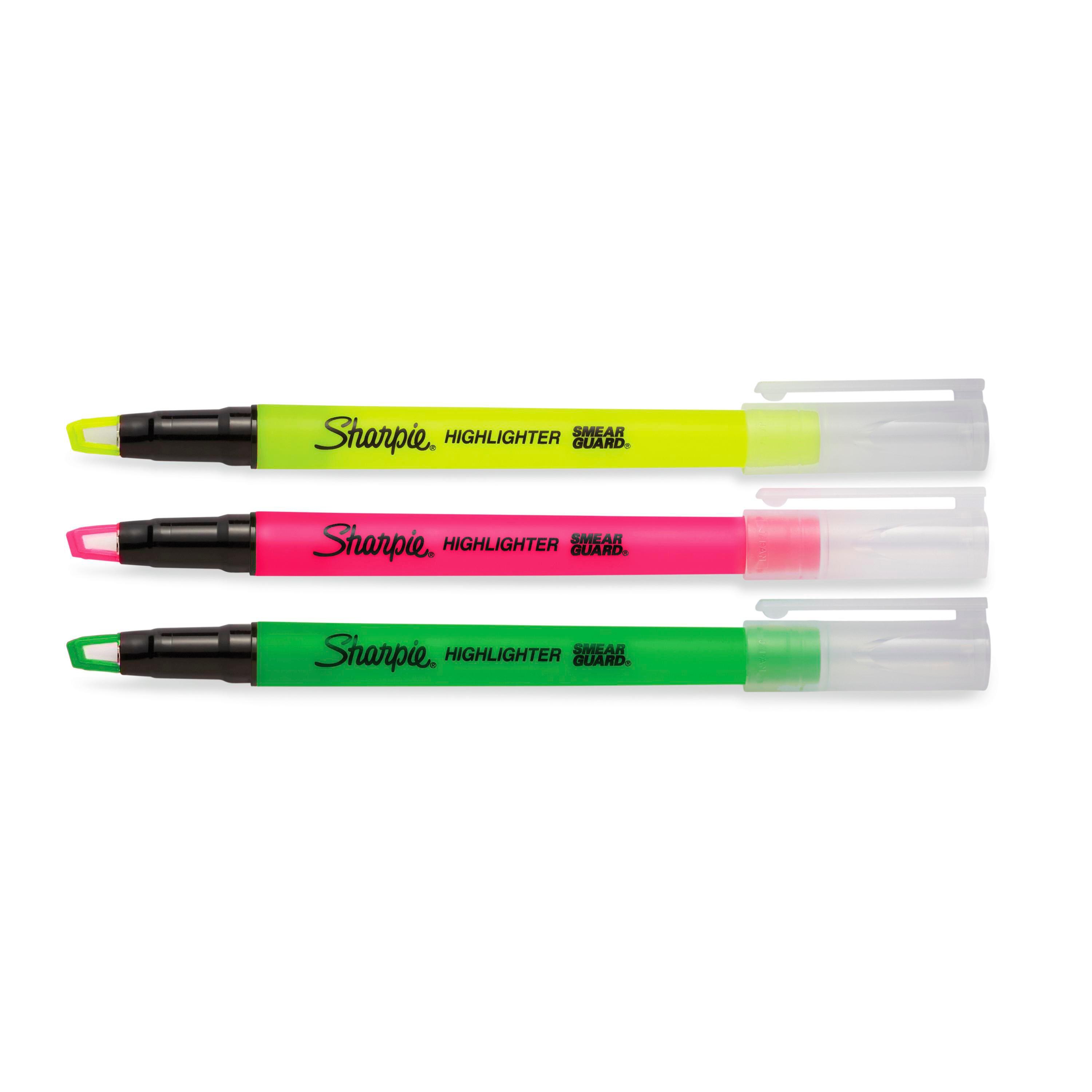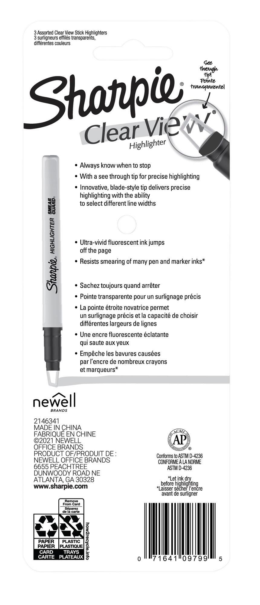 Always see where you're marking with the Sharpie Clear View Highlighter! The unique see-through tip ensures your marks are precise by keeping your eyes on the page, and can create wide and narrow lines for highlighting and underlining. These highlighters are equipped with extra vivid ink that is specially designed with Smear Guard® technology to resist the smearing of pen and marker inks. This set of 3 includes the following colors: yellow, pink, and green.
