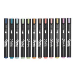 Bring your artistic vision to life in vibrant color with these Sharpie Creative Markers. These markers use a water-based acrylic ink that smoothly glides across the page, and won't bleed through. The easy control of a marker and sturdy bullet tips come together with the paint-like ink to create bold marks on light and dark surfaces including paper, metal, wood, ceramic, glass, rock, and canvas. Plus, the colors layer beautifully to add dimension to your work. This pack includes 12 markers, 1 each of the following earthtone colors: mint, light spring, primrose, amber, red orange, brick brown, pastel pink, RO1 Red, purple, dark blue, milk blue, and dazzling blue.Features