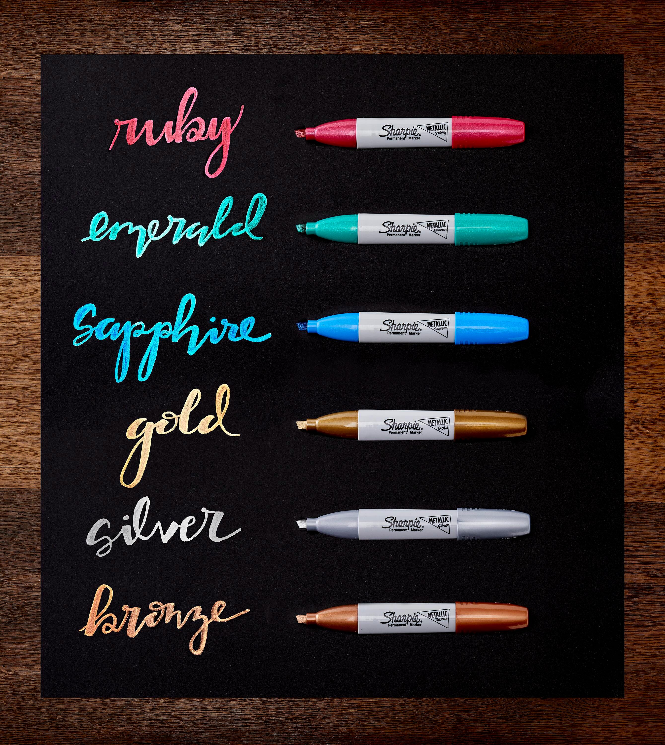 The Sharpie Metallic Permanent Markers help your creations shine. The versatile chisel tip lays down fine lines and thick marks, making these metallic permanent markers perfect for hand-lettering, coloring, labeling, and many other crafting purposes. Each permanent marker contains a large supply of specially formulated quick-drying and fade- and water-resistant ink that lasts. These markers are designed to boldly mark on any surface but are especially vivid on dark surfaces. This set includes the following colors: gold, silver, bronze, emerald, sapphire, and ruby.