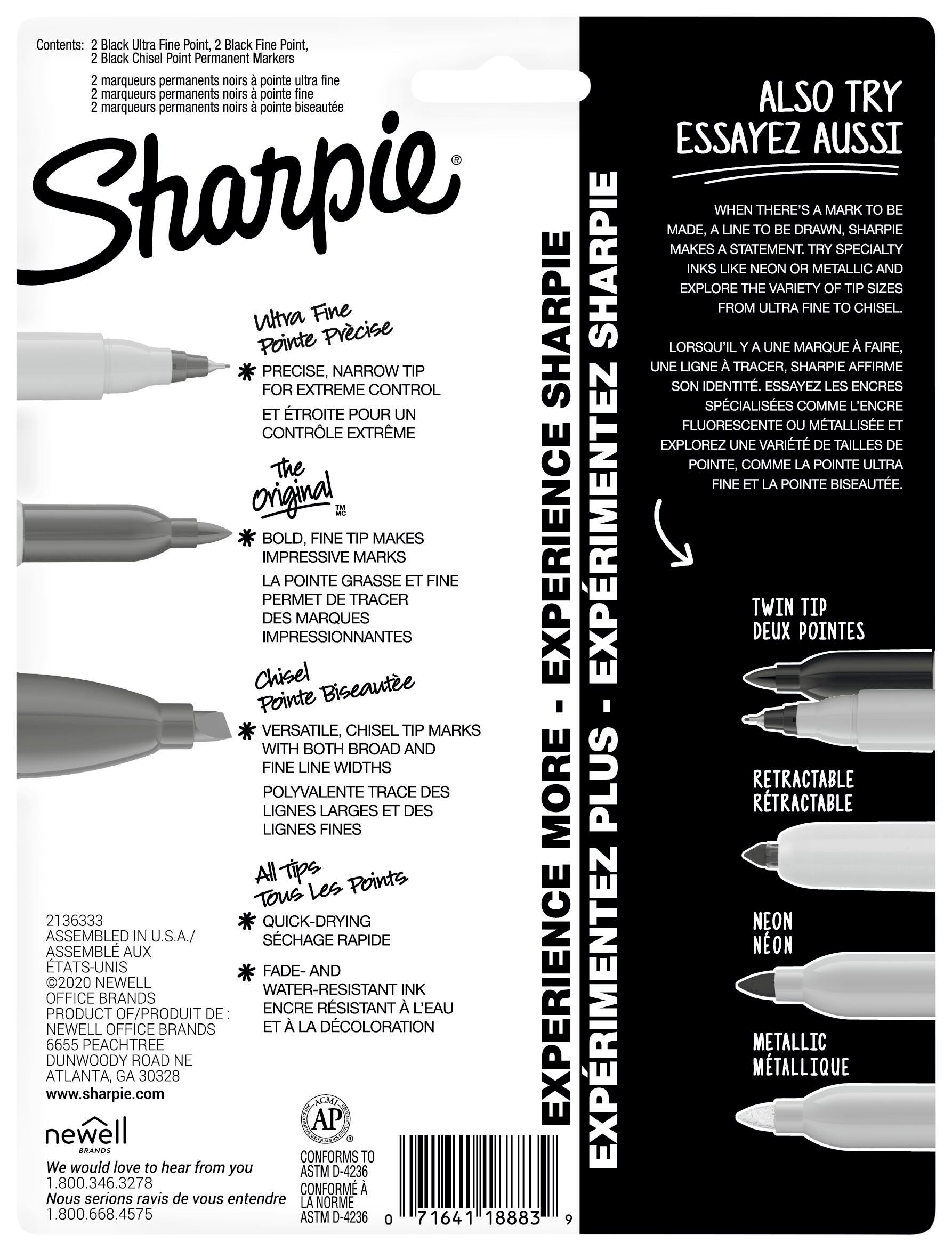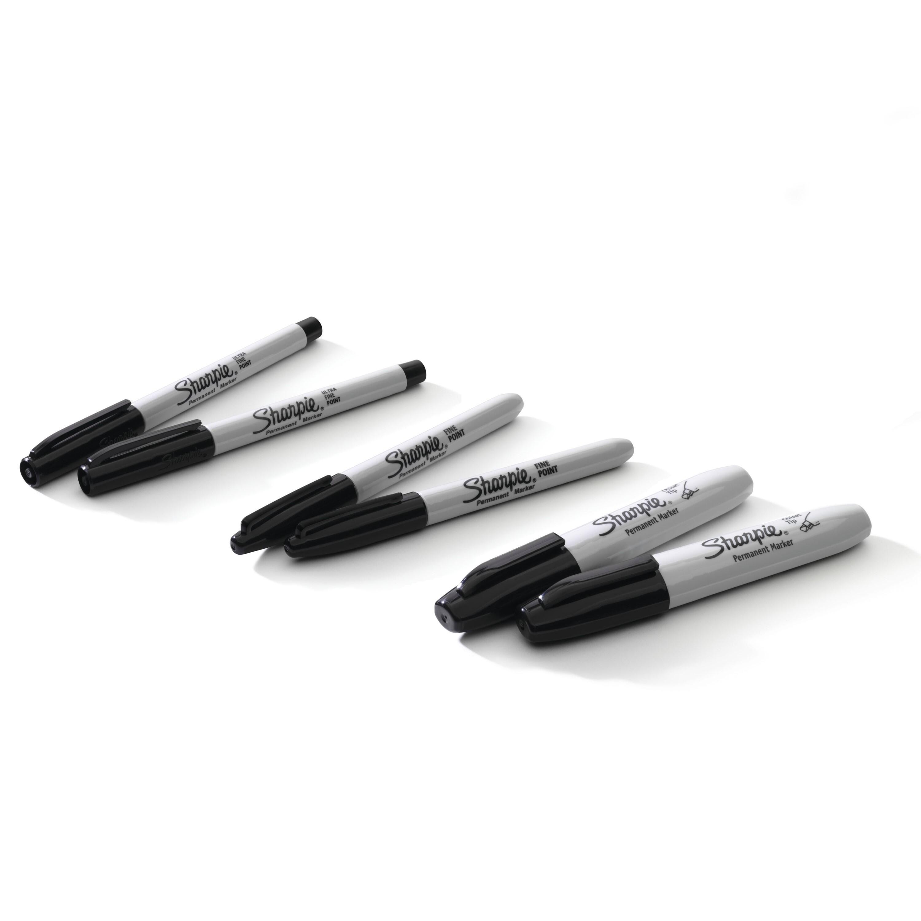 Transform dull surfaces into bold creative statements with Sharpie Permanent Markers. This pack of 6 includes fine point, ultra-fine point, and chisel tip markers so you are ready to handle any project. Each marker features the iconic black ink that creates lasting marks on almost any surface and resists fading and water.