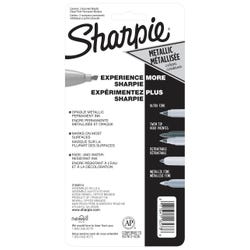 Find your shine with Sharpie Metallic Permanent Markers. These markers feature a versatile chisel tip that creates fine lines and thick marks with major style that stands out for hand-lettering, coloring, labeling, and crafting purposes. Each permanent marker delivers specially formulated metallic ink that's quick-drying and fade- and water-resistant and boldly stands out on light and dark surfaces alike (and especially on projects set against a black background). This pack of three includes a gold, silver, and bronze marker.Features