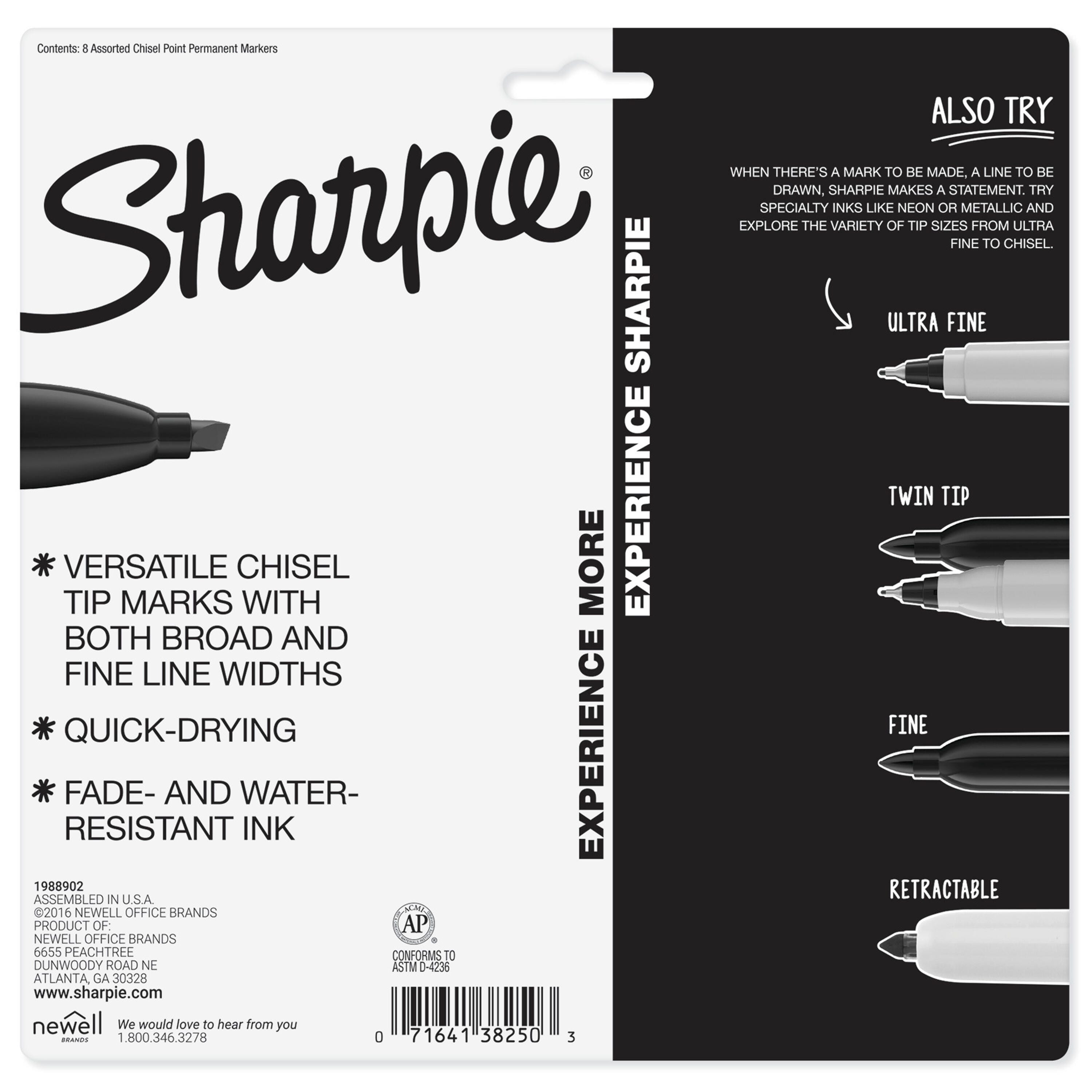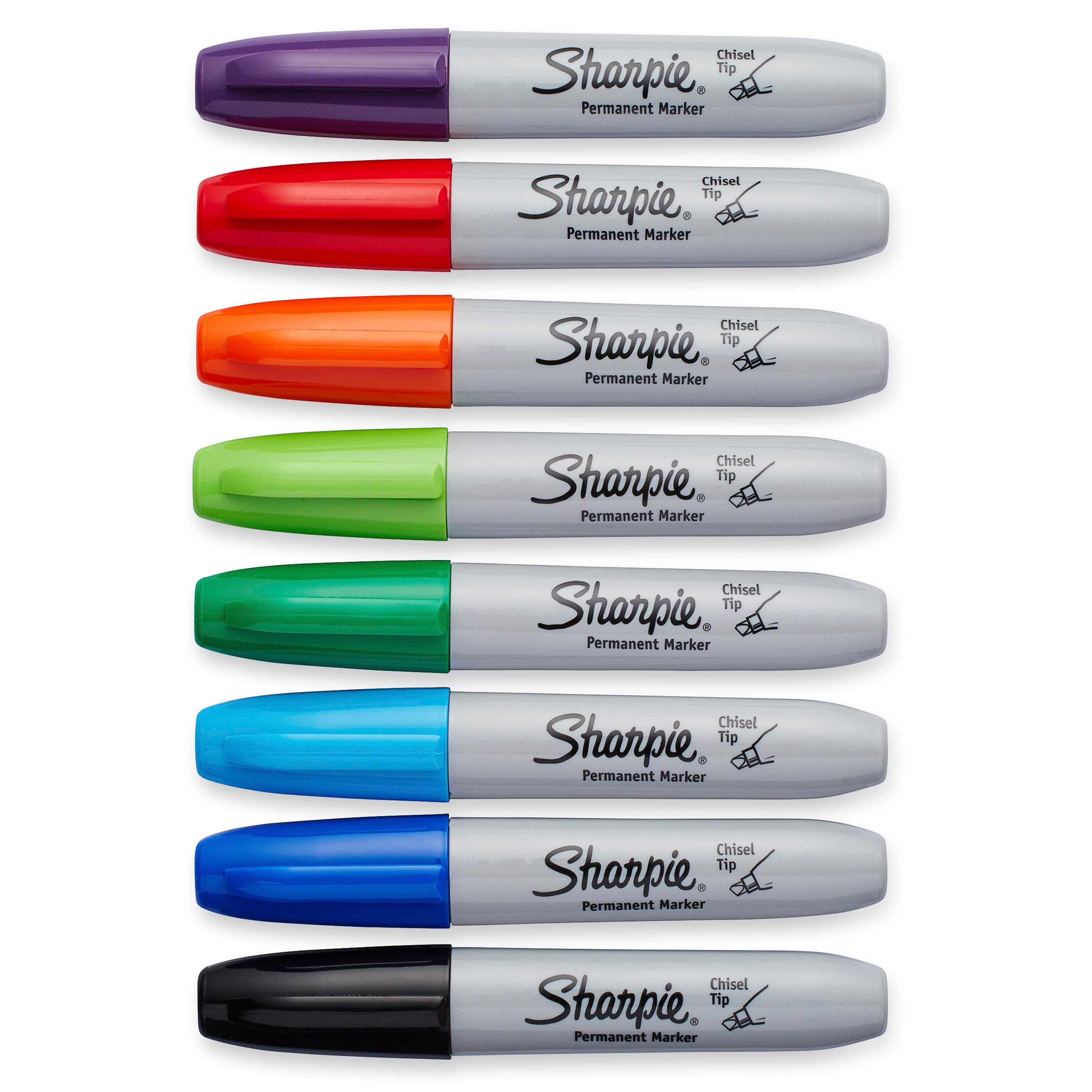 The permanent marker that writes three ways. Sharpie Chisel Tip Permanent Markers have a unique chisel tip that makes broad, medium, and fine strokes—so you can express yourself any way you want. The endlessly versatile tip is perfect for countless uses in the classroom, office, home and beyond. The iconic permanent ink dries quickly, resists both fading and water, and marks on paper, plastic, metal, and most other surfaces. The bright colors open up a world of creative possibilities.Features