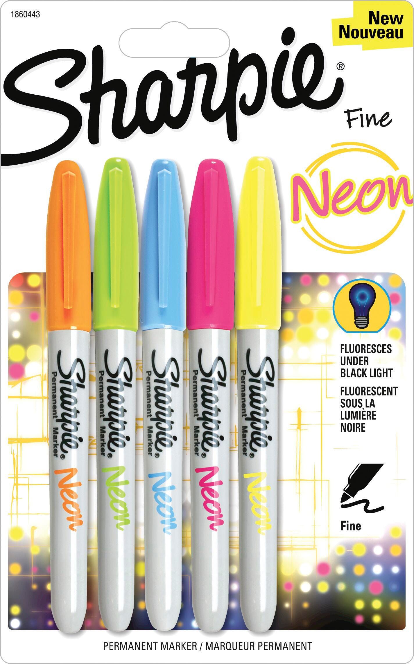 The iconic Sharpie Permanent Marker is now in luminous neon colors! These markers feature a durable fine point tip that creates bright, strong, and permanent marks on most surfaces including paper, metal, glass, plastic, foil, cloth, rubber, wax paper, and more. Each marker delivers fluorescent fun with the iconic permanent ink that is quick-drying and fade- and water-resistant to ensure your marks last. This set of 5 permanent markers includes the following colors: neon green, neon orange, neon blue, neon yellow, and neon pink.Features