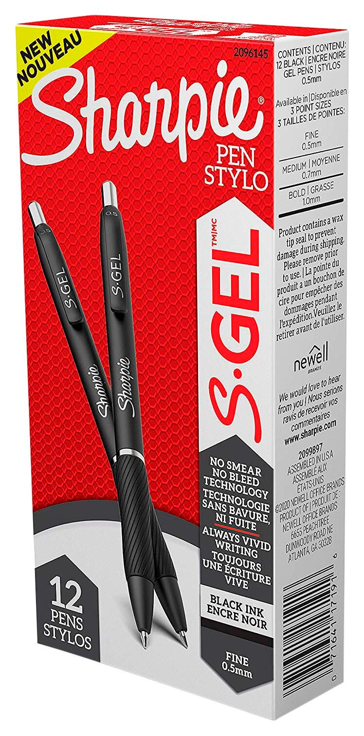 Sharpie S-Gel Pens, Fine Point, 0.5 mm, Black Ink, Pack of 12