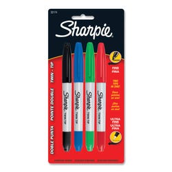 Sharpie Twin Tip Permanent Markers deliver unmatched versatility with a double-tip design, featuring a fine point on one end and a precise ultra-fine point on the other. The markers contain the iconic permanent ink that creates lasting marks on nearly any surface. This set of 4 contains the following colors: black, blue, green, and red.Features