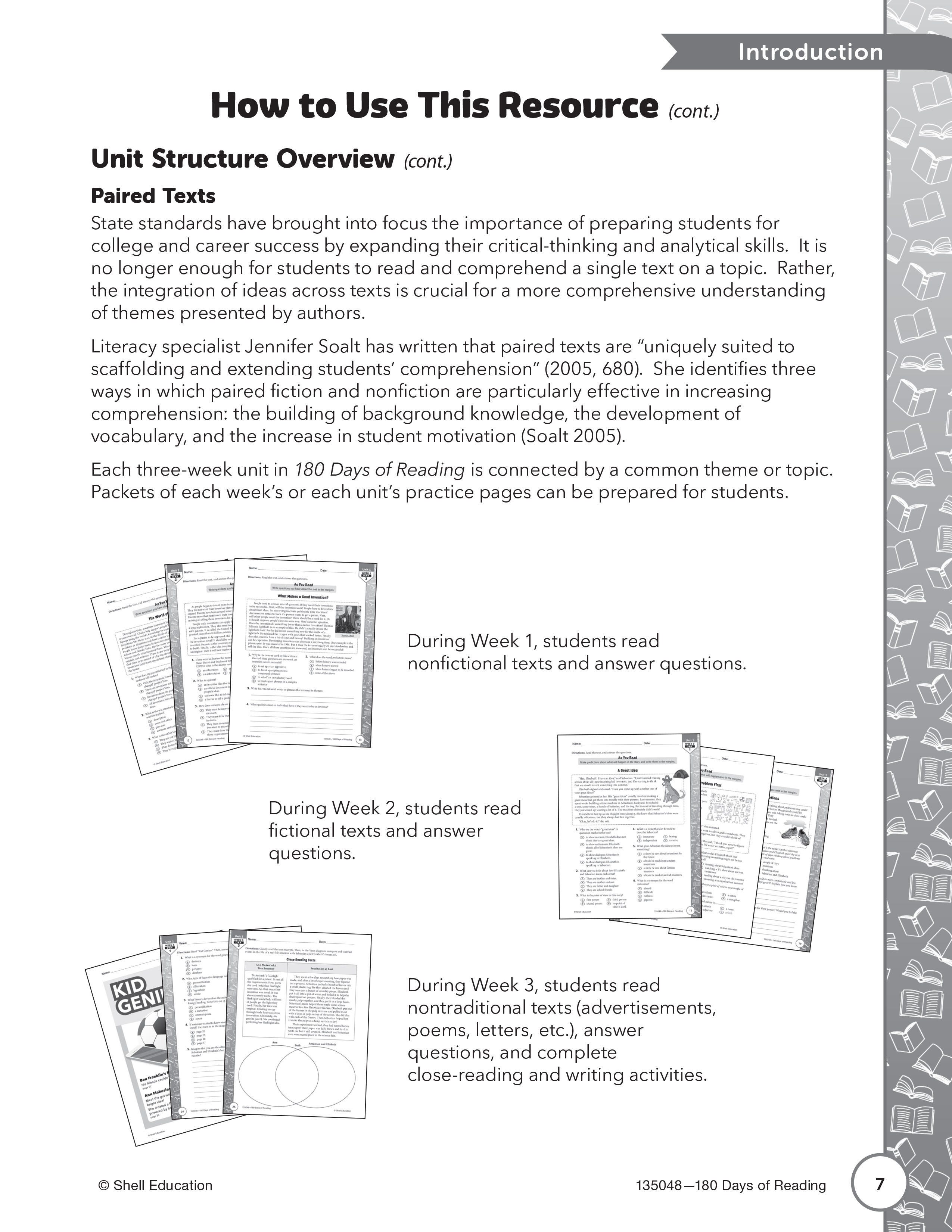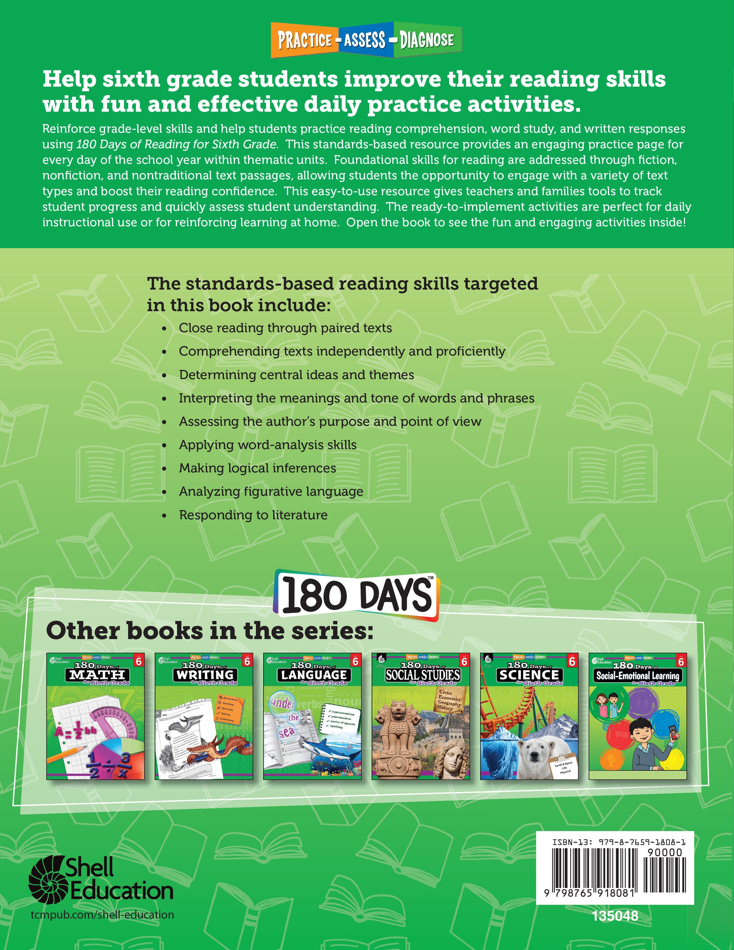 Develop advanced reading skills with 180 Days of Reading, 2nd Edition, a workbook of engaging and effective daily practice activities. This easy-to-use sixth grade workbook is great for at-home learning or classroom instruction. Encourage students to read and write more confidently with these standards-based learning activities. The 2nd Edition of this activity book incorporates thematic units and a combination of fiction, nonfiction, and nontraditional texts. The new edition also reinforces the connection between reading and writing by having students write about what they read. Parents appreciate the grade-appropriate reading passages and interesting topics that children will enjoy. The daily reading practice is ideal for homeschool, to reinforce learning at school, or to prepare for middle school. Teachers rely on these workbooks to save them valuable time and address learning gaps.