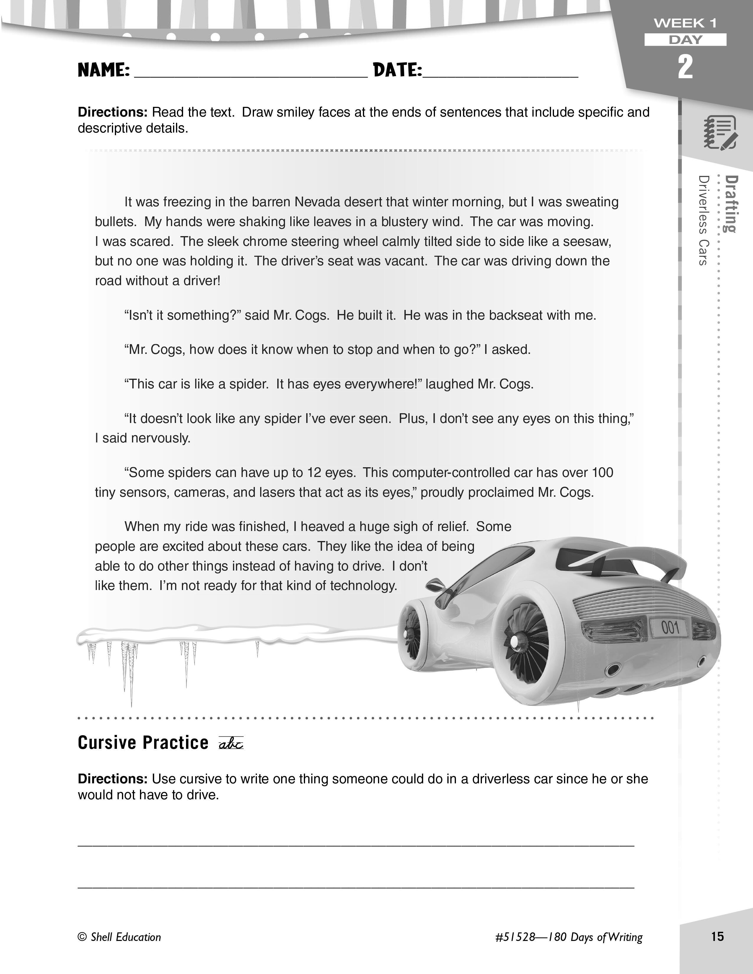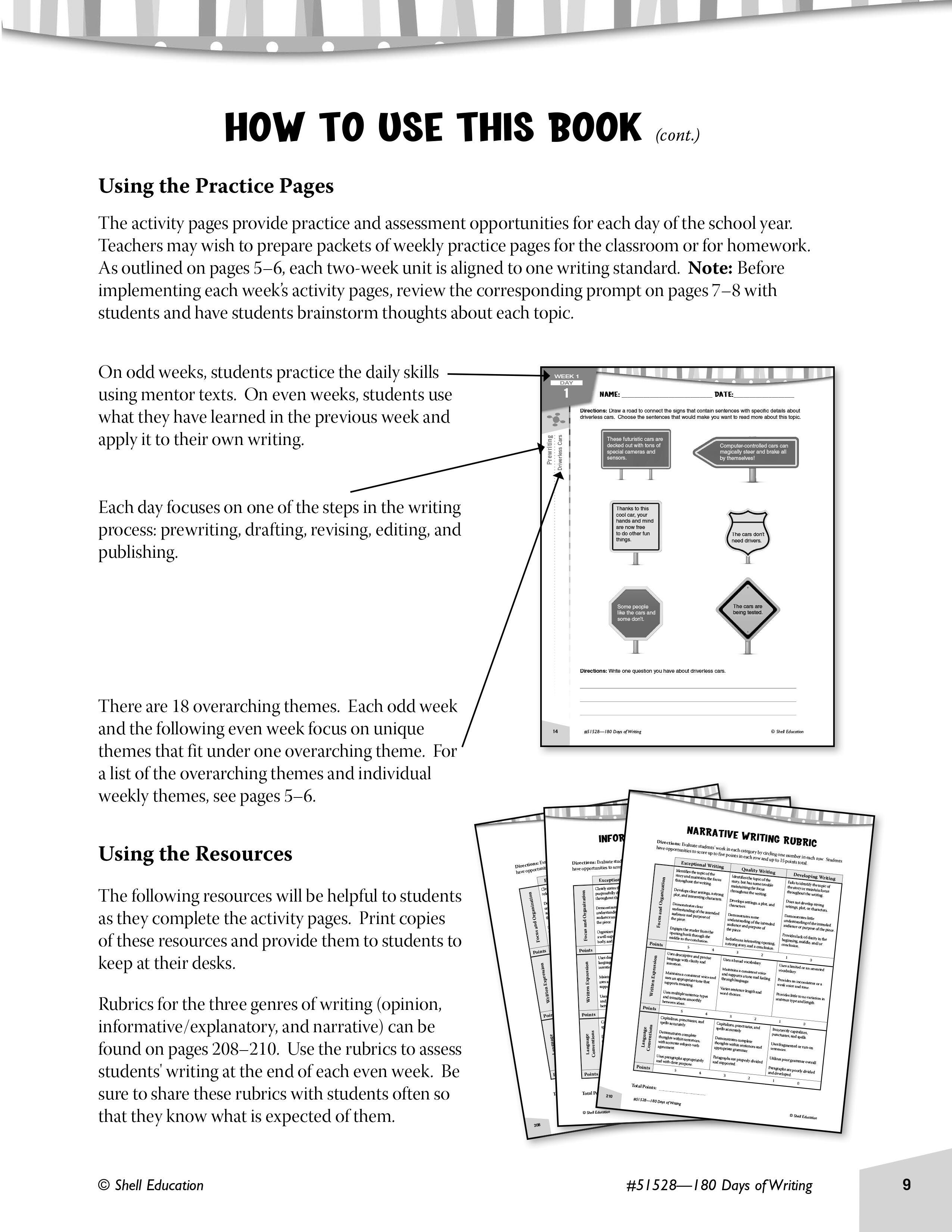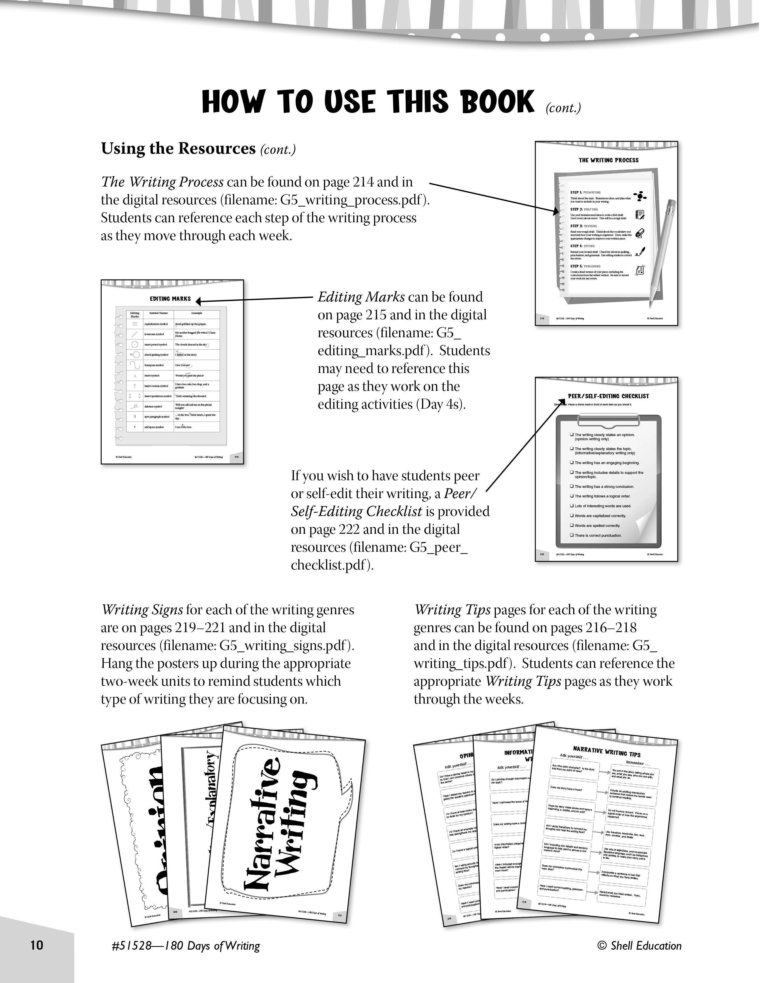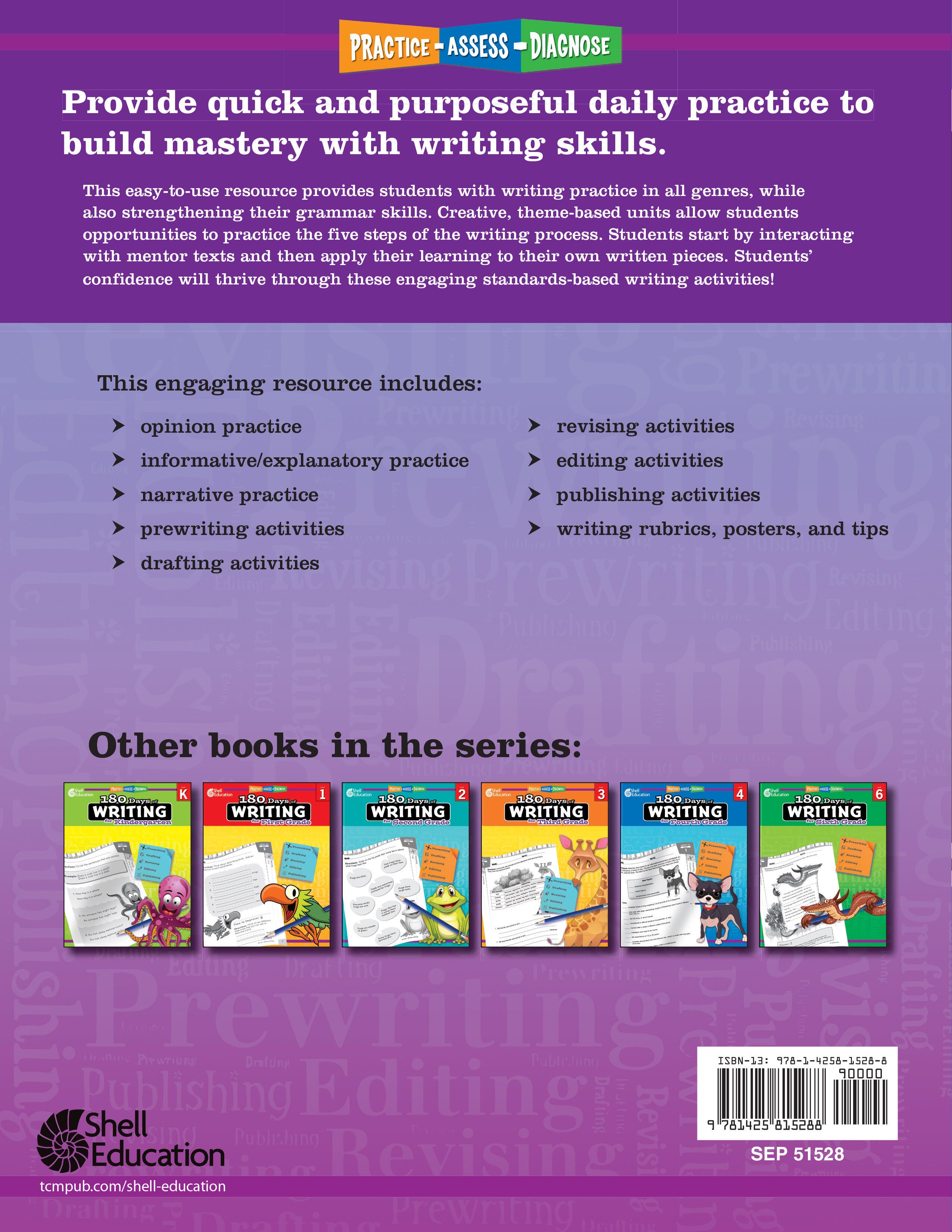 180 Days of Writing is a fun and effective daily practice workbook designed to help students become better writers. This easy-to-use fifth grade workbook is great for at-home learning or in the classroom. The engaging standards-based writing activities cover grade-level skills with easy to follow instructions and an answer key to quickly assess student understanding. Each week students are guided through the five steps of the writing process: prewriting, drafting, revising, editing, and publishing. Watch student confidence grow while building important writing, grammar, and language skills with independent learning.Parents appreciate the teacher-approved activity books that keep their child engaged and learning. Great for homeschooling, to reinforce learning at school, or prevent learning loss over summer.Teachers rely on the daily practice workbooks to save them valuable time. The ready to implement activities are perfect for daily morning review or homework. The activities can also be used for intervention skill building to address learning gaps.