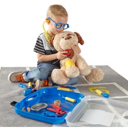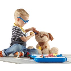 Features enough medical tools for the whole junior surgical staff to operate. Sturdy plastic 19-piece set includes a battery-operated stethoscope, realistic-sounding cell phone, forceps, bandages, thermometer, and more. Everything fits into a plastic, clamp-tight case. Includes batteries for stethoscope. Cell phone requires 2 AAA batteries, not included. Case measures 14-1/2 L x 3-1/3 W x 12-1/2 H inches. Ages 3 and up.Features