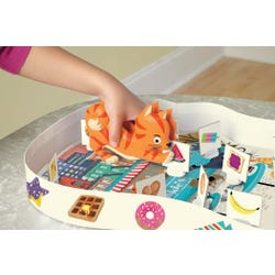 Includes:1 Colorful Game Board 1 Frankie Cat Squeezer 20 Food Game Pieces 4 Placemat Player Boards 1 Game Spinner 1 Instruction Guide