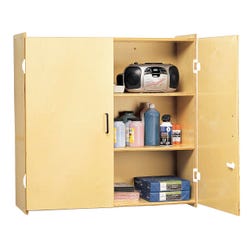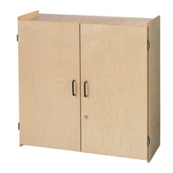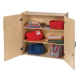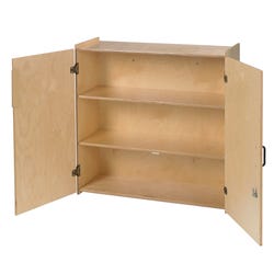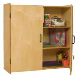 The Childcraft® Locking Wall-Storage Cabinet provides a safe and organized storage solution for classrooms, offices, and childcare centers. Featuring three deep-set shelves, this sturdy storage unit offers ample space for books, art materials, and teacher supplies. Locking doors with pinch-proof hinges keep items securely stored and out of reach from children. Built from high-quality birch veneer, this wooden cabinet offers both durability and a timeless look. Its UV-cured acrylic finish is resistant to marks, stains, and frequent cleanings for long-term use. Fully assembled and wall-mountable, this lockable cabinet measures 35-3/4 W x 13-3/4 D x 35-3/4 H inches.Features