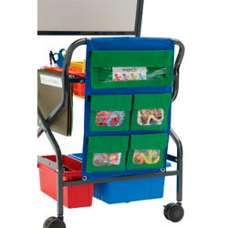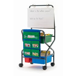 Compact, folding trolley is the perfect organizer for daily literacy intervention programs and other traveling educators' needs. Comes with various size tubs, a storage pocket center, and rungs for hanging file folders (folders not included). Features removable whiteboard surface, built-in book and marker ledge, and chart hooks to hang work in progress. Perfect for small group or individual lessons. Trolley measures 20 W x 16 D x 46 H inches with whiteboard and 20 W x 16 D x 28 H inches without whiteboard. Removable whiteboard measures 20 W x 15-1/2 H inches.Features