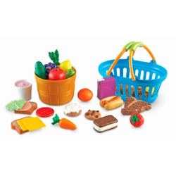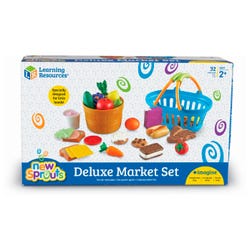 The New Sprouts Deluxe Market Set from Learning Resources is the one-stop food shop for your playroom, classroom, care center, and beyond! Encourage a more realistic dramatic play experience with these 30 pretend play pieces of meats, fresh produce, and other meal essentials. Includes a grocery basket with handles and a bushel basket to offer the perfect storage and carry-all aid for gathering items at pretend supermarkets, farmer's markets, or play kitchens. Set of 32 pieces total (30 food/drink play pieces and 2 baskets). For ages 18 months and up.Features