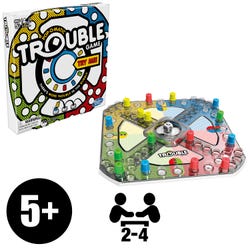 Get ready to race to the finish line in this exciting game with the classic Pop-O-Matic bubble that holds and rolls the die. Suspense builds as you try to land on the Double Trouble or Warp spaces that give you additional powers. Can you chase your opponents around the board without getting into trouble and getting sent back to the starting line? The first player to get all four game pieces to the finish zone wins the game. 2-4 players, ages 5 and up.Features