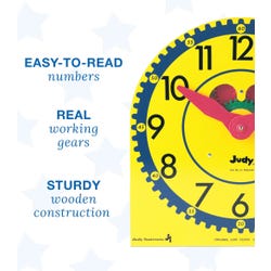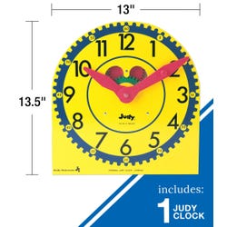 Judy Instructo Original Judy Clock for grades K to 3 measures 12-3/4 in x 13-1/2 in and features easy-to-read numerals that show elapsed time in 5 min intervals. Clock comes with visible functioning gears that maintain correct hour hand and minute hand relationships. These clocks are permanently assembled with wood and a handy metal stand.Features