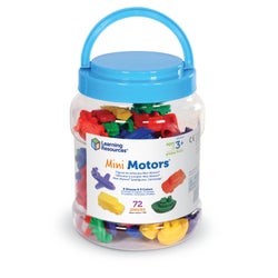 Learning Resources Mini Motors are not only great for practicing early math skills such as counting, sorting and making patterns, but they're also teeming with imaginative play possibilities. These soft rubber counters easily wipe clean so they can be used again and again. This set features planes, boats, cars, trains, firetrucks, and buses in 6 bright colors. The vehicles measure 1-1/2 to 2 inches in length. This set includes a plastic storage bucket and an Activity Guide. Grades PreK and Above, Ages 3 and Above. Set of 72.Features