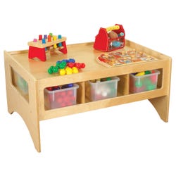 Childcraft® Toddler Multi-Purpose Play Table offers endless possibilities for creative exploration. Designed with a removable building base top, it’s perfect for building blocks, puzzles, and other hands-on activities. The raised edges along the tabletop prevent pieces from sliding off, while cubby spaces underneath provide ample storage for trays, baskets, or bins. This set includes the building brick top and 6 translucent trays. Constructed with an environmentally friendly, stain-resistant finish, this activity table ensures long-lasting durability and easy maintenance in daycare centers, classrooms, waiting areas, and playrooms. Simple assembly required. The children’s table measures 36 W x 26 D x 18 H inches, ideal for toddlers' height and activities.Features