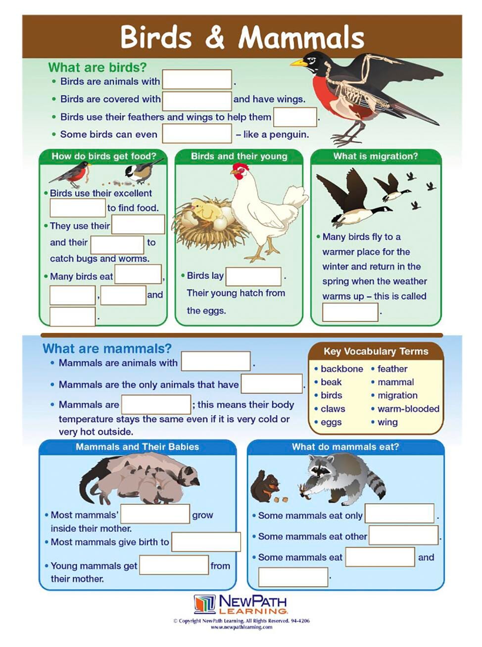 Complete, easy-to-use and engaging, the Birds & Mammals Learning Center is ideal for the instruction and review of this key, standards-based concept. Designed for either teacher-directed instruction or independent use by groups of 2 to 4 students, the Learning Center provides complete, leveled coverage of this curriculum-aligned topic, making it perfect for differentiated instruction. To use, the students first work individually or in pairs using the 4 laminated Visual Learning Guides provided on the topic. The guide provides a graphic, easy-to-follow overview of the concept; “Write-On/Wipe-Off” activities and graphic organizers; and a set of guiding, assessment review questions. They then form in a group to play the Curriculum Mastery Game included for cooperative or competitive review and reinforcement of the concepts. Packaged in a durable pouch, the Learning Center is a ready-to-use resource for the classroom, after school and summer school programs or at home for test preparation, practice and review! Grades 1 - 2.Features