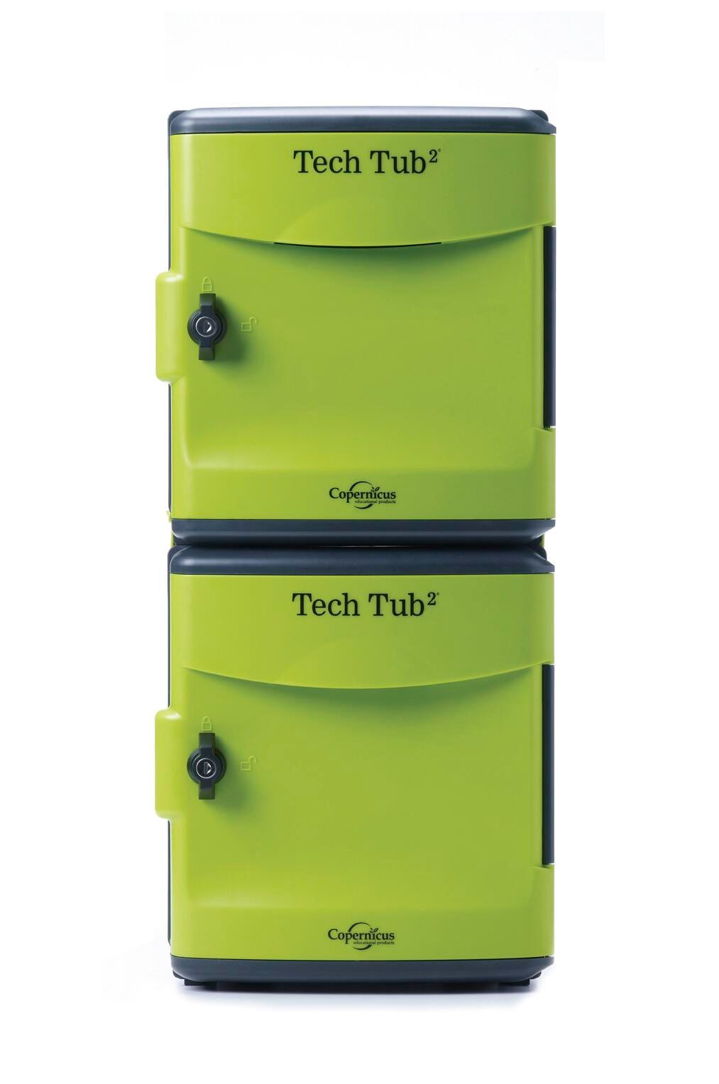 The premium Tech Tub2 is made from durable, high-impact ABS plastic and has 10 port USB hub that syncs and charges iPads. Ventilation holes throughout the case prevent heat build-up. There are two ergonomic handles on the door and back as well as a flip-up handle on the top. The adjustable shelves accommodate devices with and without cases. To keep cords and adapters tidy, there is an easy-to-use side cable organizer and lower compartment. Cable hooks are on the back to manage the cord during transport. To secure the tub to a surface, there is mounting hardware. Tub has a 3-point lock and comes with 2 sets of keys. Please note, this Tech Tub is not compatible with 8th Generation iPads. For an iPad 8 charging solution, please purchase item# 2087480.Features
