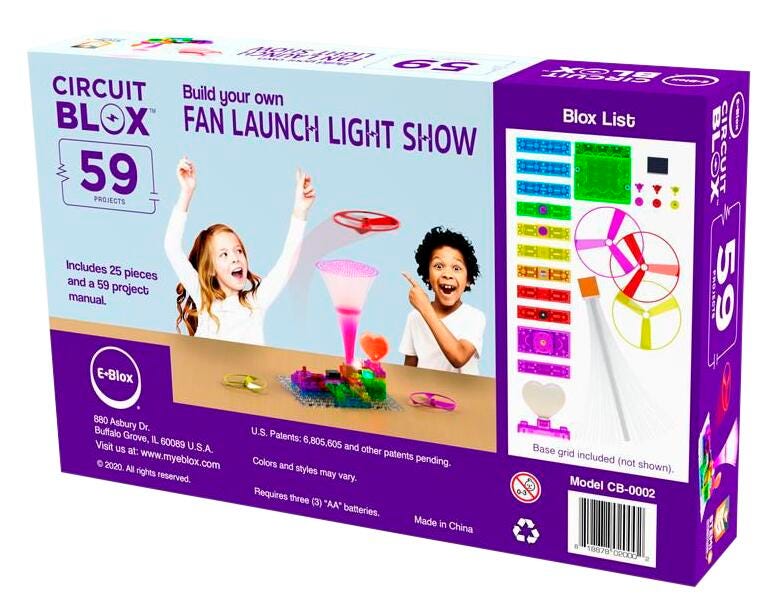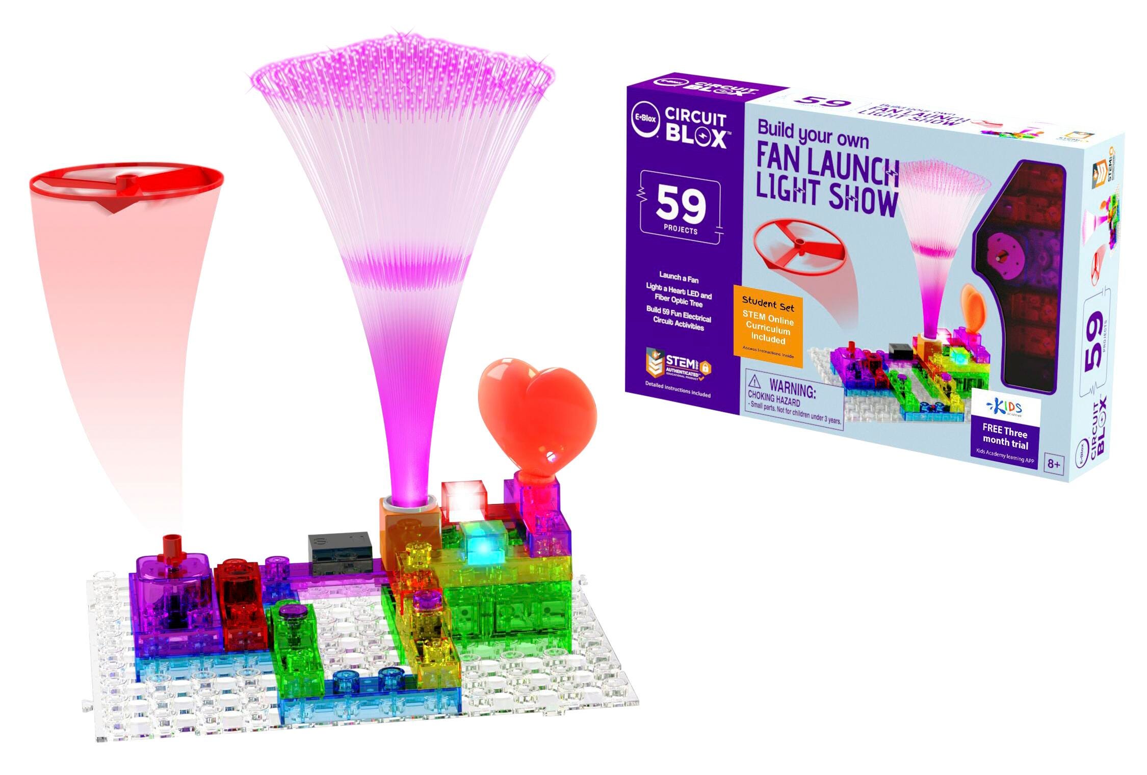 This set is ideal for home schooling and teaching through e-learning of STEM. The colorful building blocks contain electronic components such as a battery module, switches, LEDs, fiber tree, beeper and a motor. Includes online animated curriculum only available with E-Blox Student Sets. Lessons cover Electricity & Circuit, Motors & Flying Saucers, Light, Sound, Switches, Telecommunications & Morse Code.Features