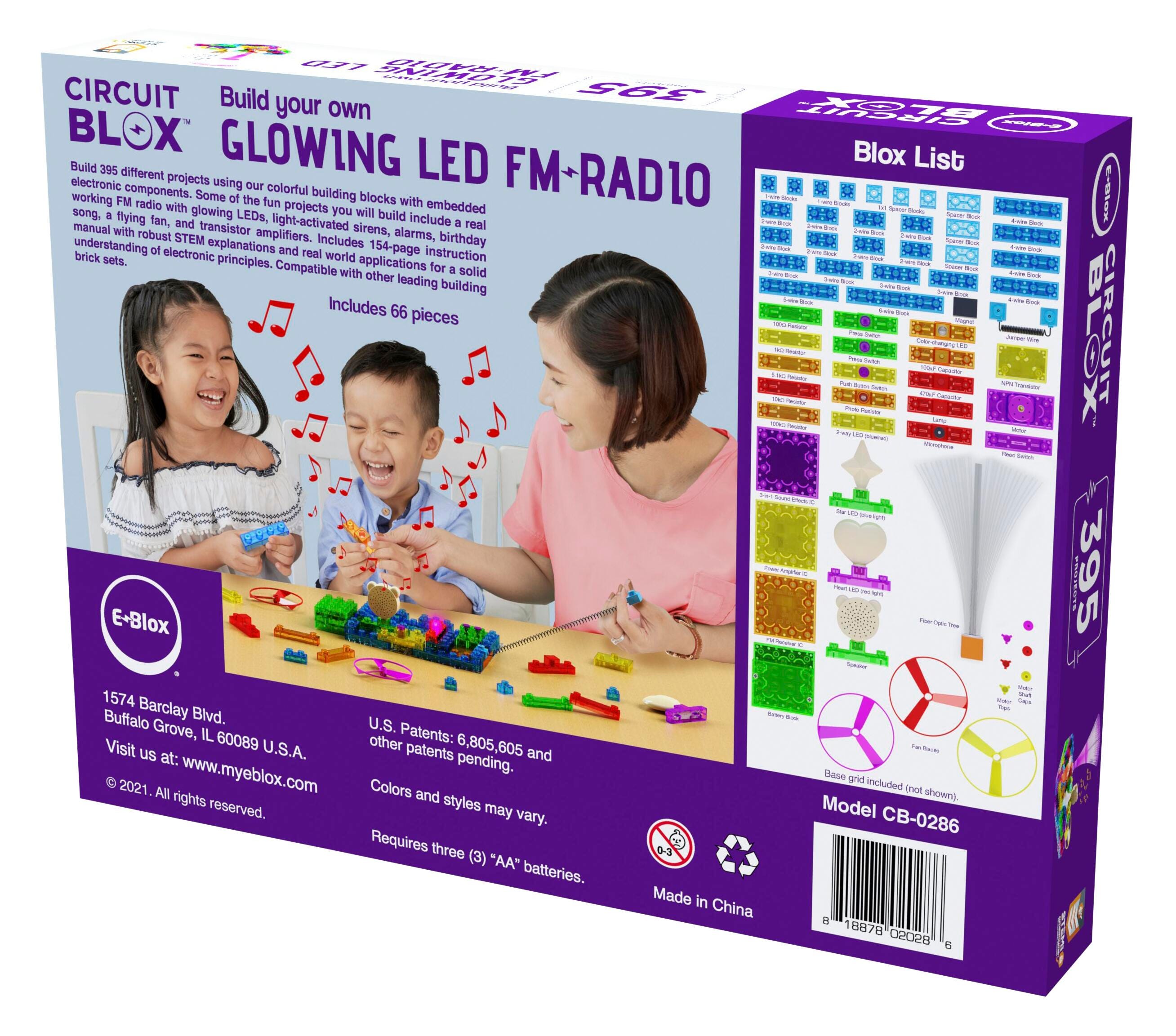 This kit provides hours of fun and educational play. The colorful building blocks contain electronic components such as a battery module, switches, LEDs, resistors, photoresistor, capacitors, transistor, motor, speaker, IC sound module, amplifier or FM receiver. Build 395 different 3D circuits that teach STEM and light a star, spin a motor to launch a fan high in the air, play music, sirens and space battle sounds, and even build your own FM radio and alram clock!