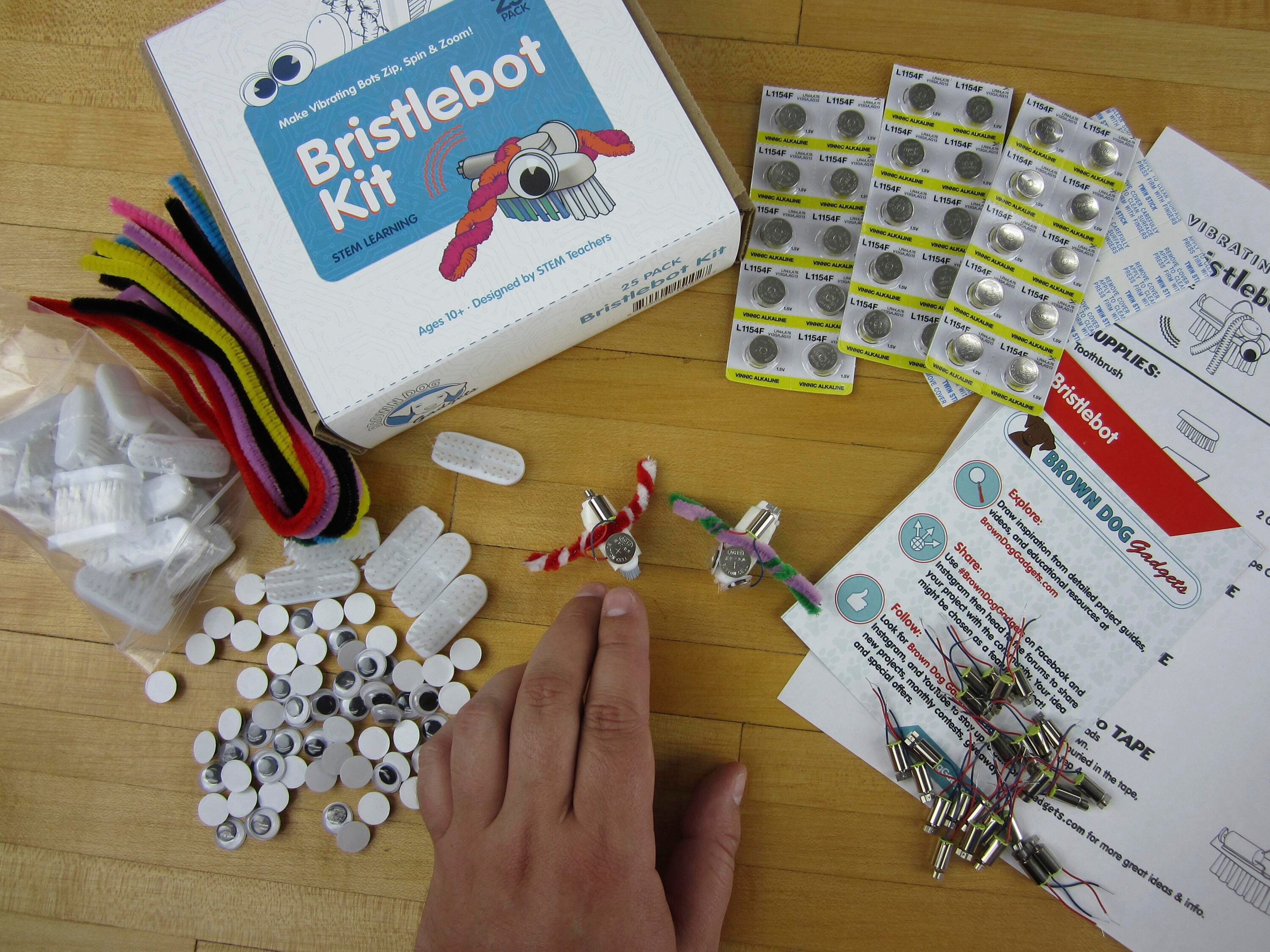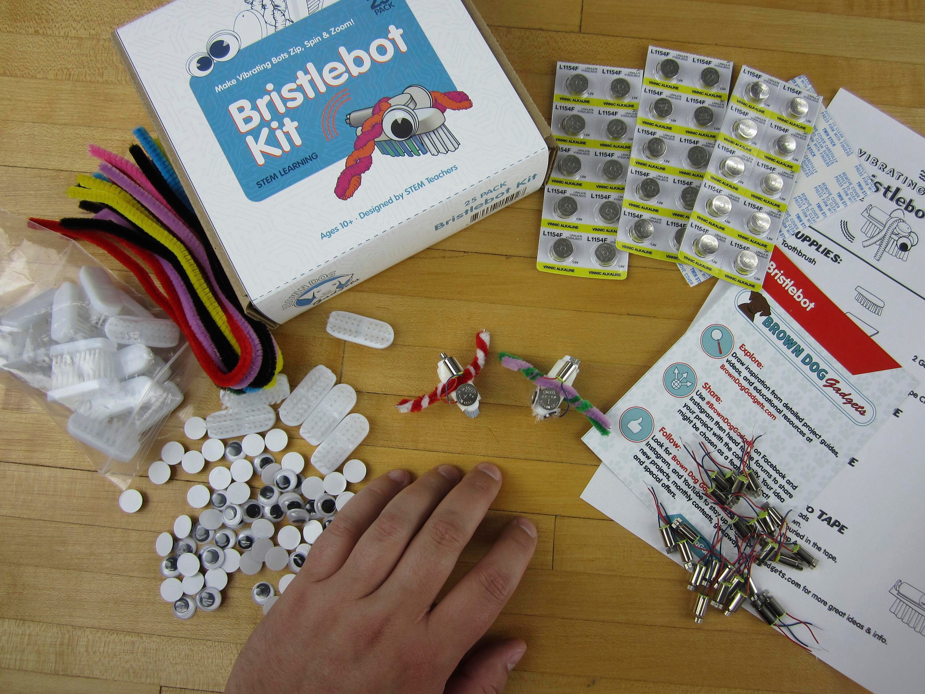 Introduces concepts of engineering, balance, and motion. Simple to use and high interest. Includes leveled lesson plans and educational resources.Twenty Five complete sets of supplies to create your own Bristlebots, includes a mini direction card and access to online directions and educational resources.
