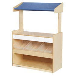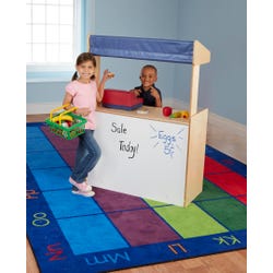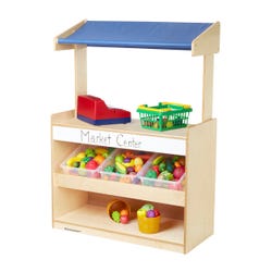 The Childcraft® Market Stand inspires imaginative role-play, social interaction, and early business skills. This set includes clear trays. Designed with a blue fabric awning, a spacious sales counter, and two shelves for storage, the play stand allows children to pretend to buy, sell, and barter just like in a real store. The large magnetic dry-erase panel at the front lets children write store names, daily specials, or pricing, enhancing creativity and literacy skills. The open design also doubles as a puppet theater, making it a multi-functional addition to any dramatic play area. This play store measures 35-3/4 W x 16 D x 49-7/8 H inches.Features