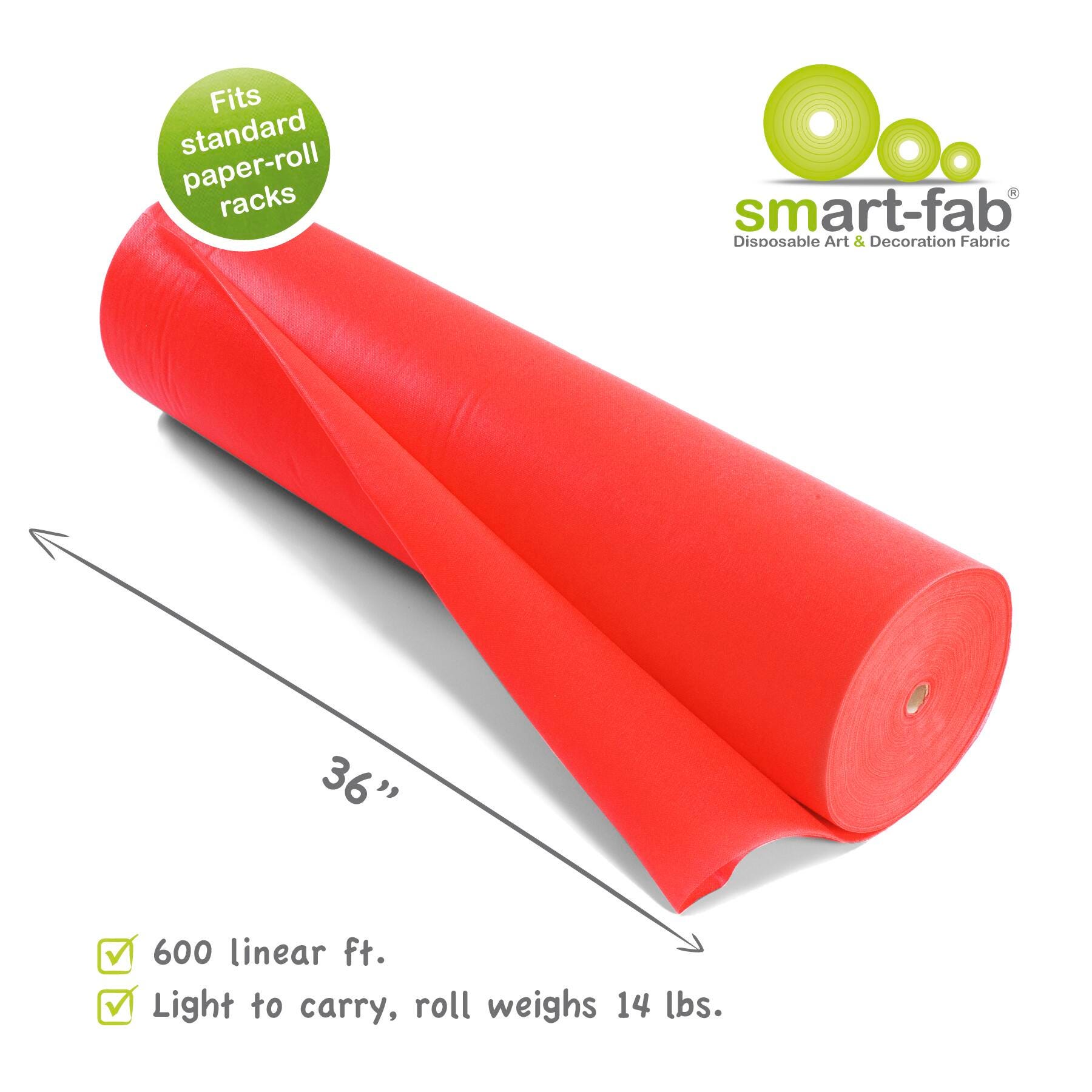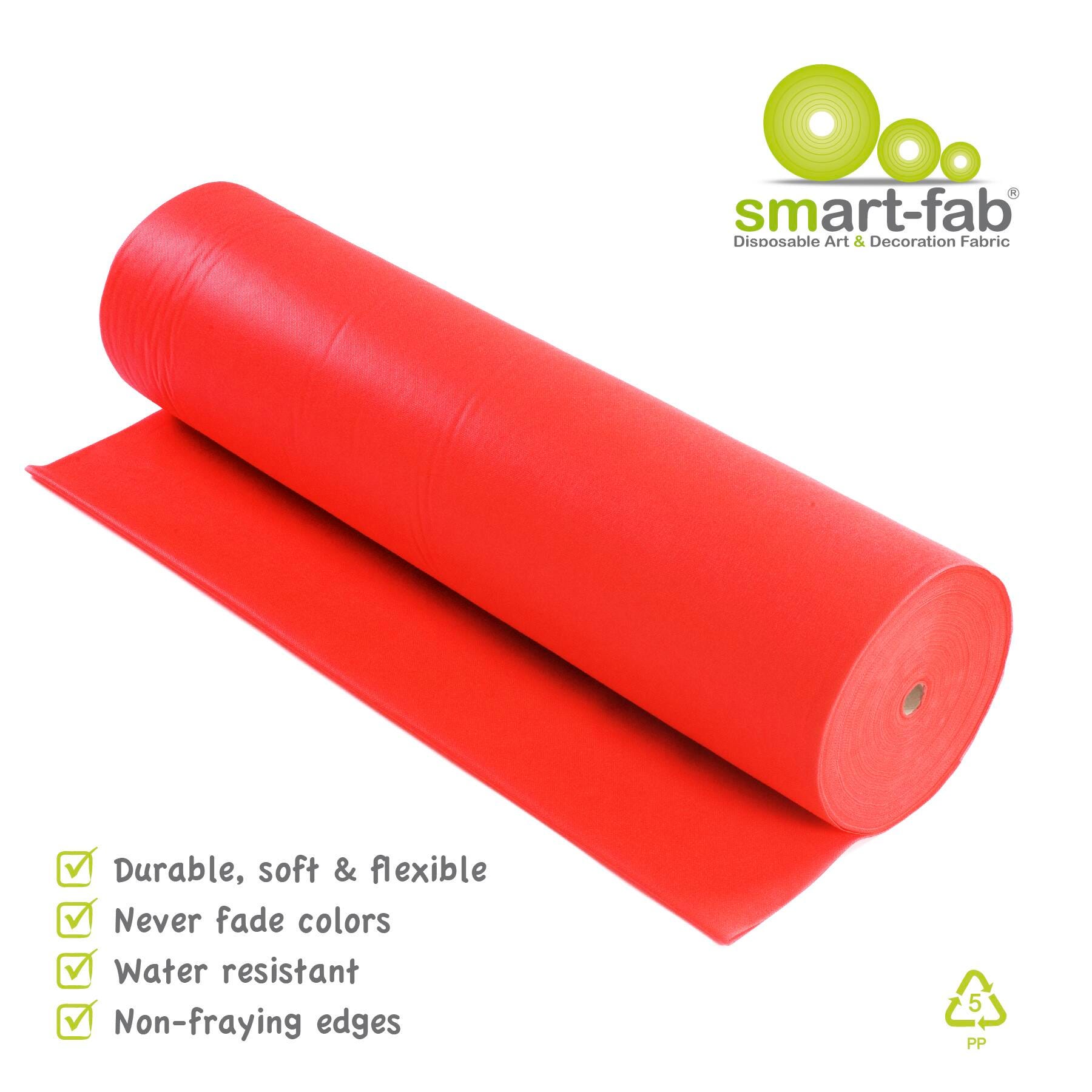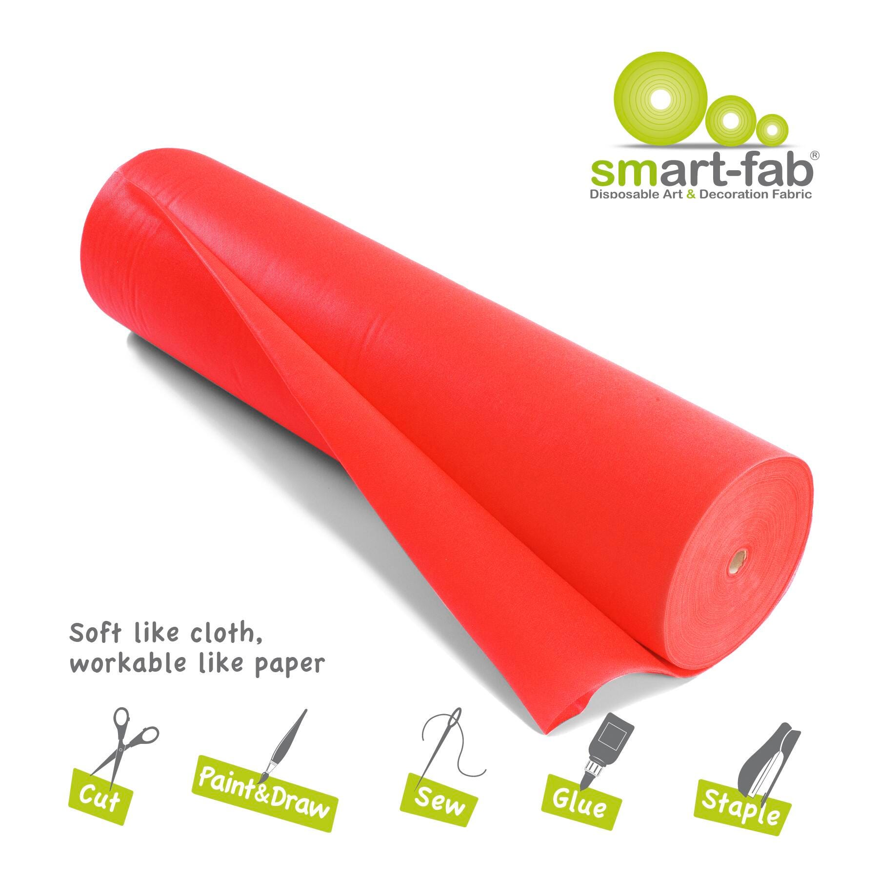 Smart-Fab Non-Woven Fabric Roll measuring 36 in x 600 ft in red is an innovative artistic and educational medium. It's bold, brilliant colors are in the material itself, so they won't fade and look great from either side. Soft and pliable yet strong and durable, smart-fab won't rip, fray or wear out, yet it's easy to cut, fold, twist, crimp, ruffle and glue. The cloth-like texture makes it pleasant to handle, yet firm enough to be used in 3-D creations and it is great for outdoor use. It is water and wear resistant but can be easily colored with paints, crayons, markers and all popular art media. Roll is also convenient to store, supplied in rolls that fit standard paper roll racks.Features