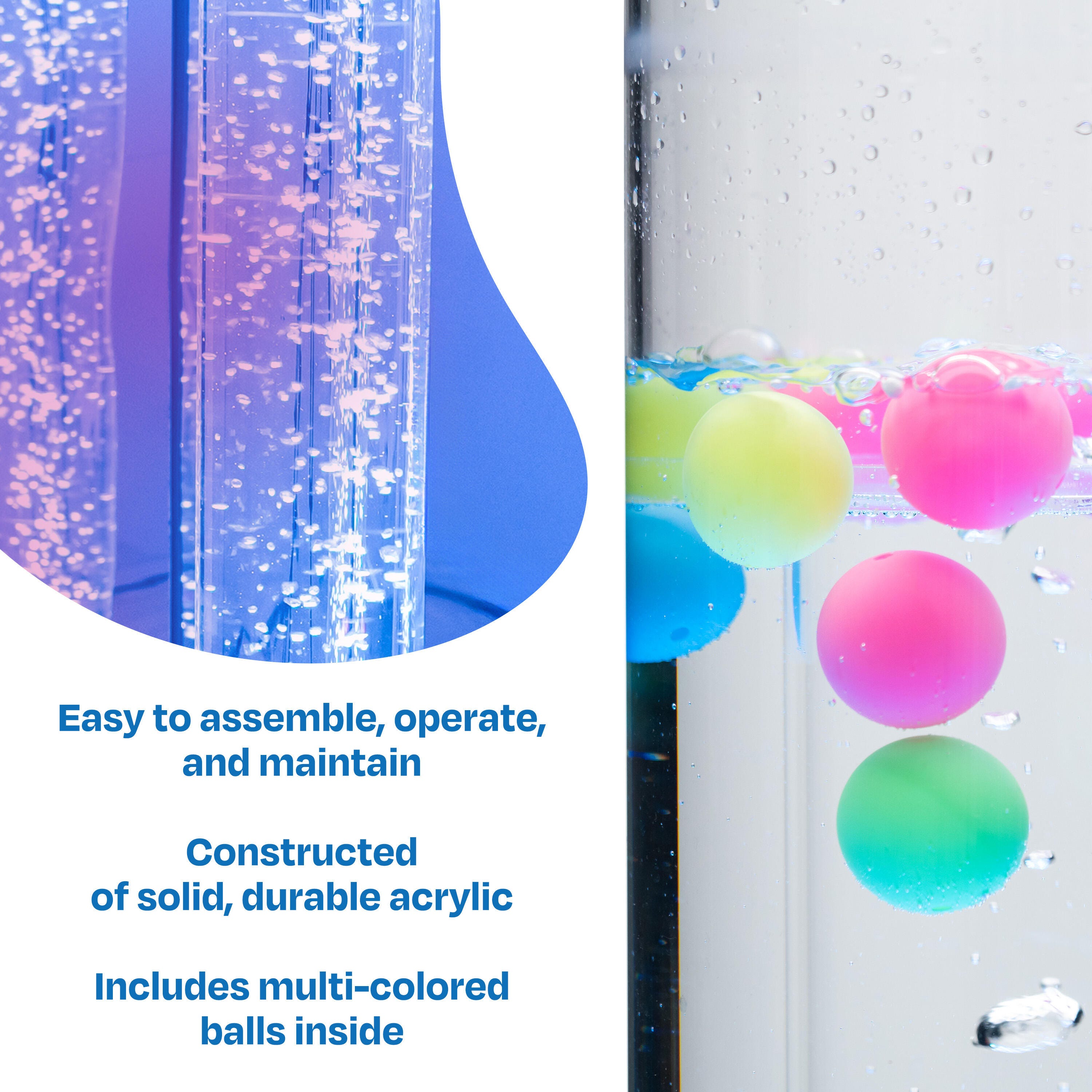 This Snoezelen® Balls-in-Bubble Tube is an essential component of Snoezelen Multi-Sensory Environments (MSEs), suitable for all ages and abilities. This bubble tube comes with color-changing LED lights and multi-colored balls that move slowly inside. The sensory tool can be used as a focal point to encourage visual tracking, color recognition, physical movement (reaching and looking up), hand-eye coordination, and communication. Users can control the bubble tubes with a variety of Snoezelen WiFi wireless controllers (sold separately) - selecting the color of their choice for an individualized experience. LED colors include: Red, Orange, Yellow, Green, Blue, Purple, Pink, and White. We offer a full range of Snoezelen bubble tube styles and sizes. View the product brochure.