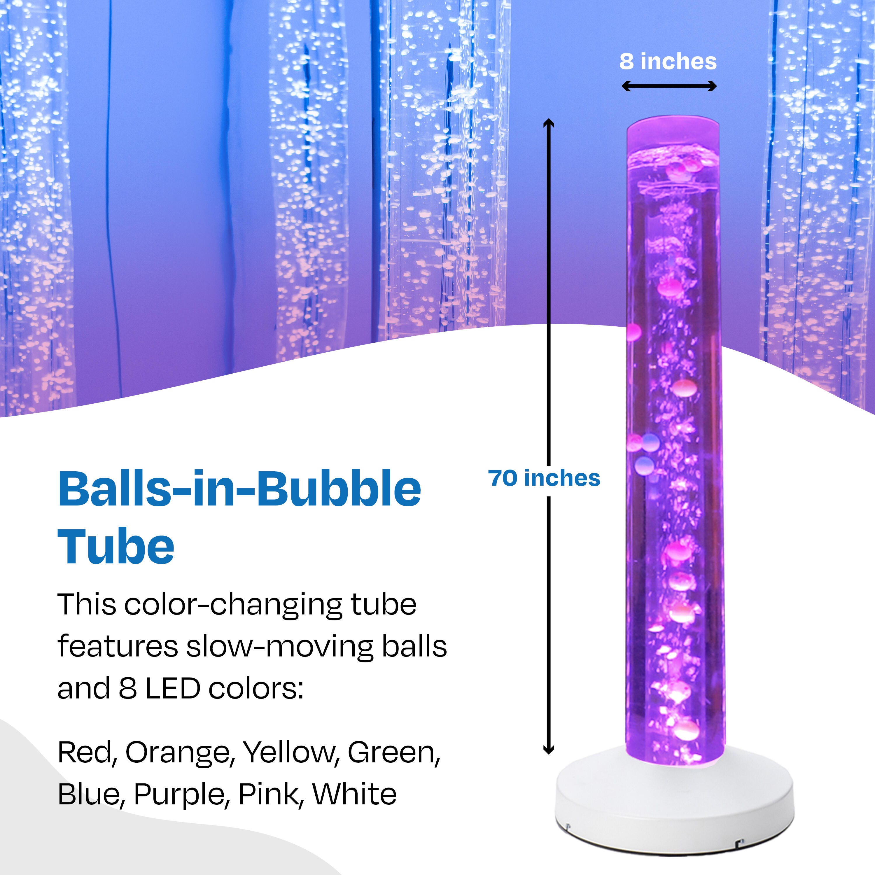 This color-changing tube with balls measures 70 inches H x 8 inches D