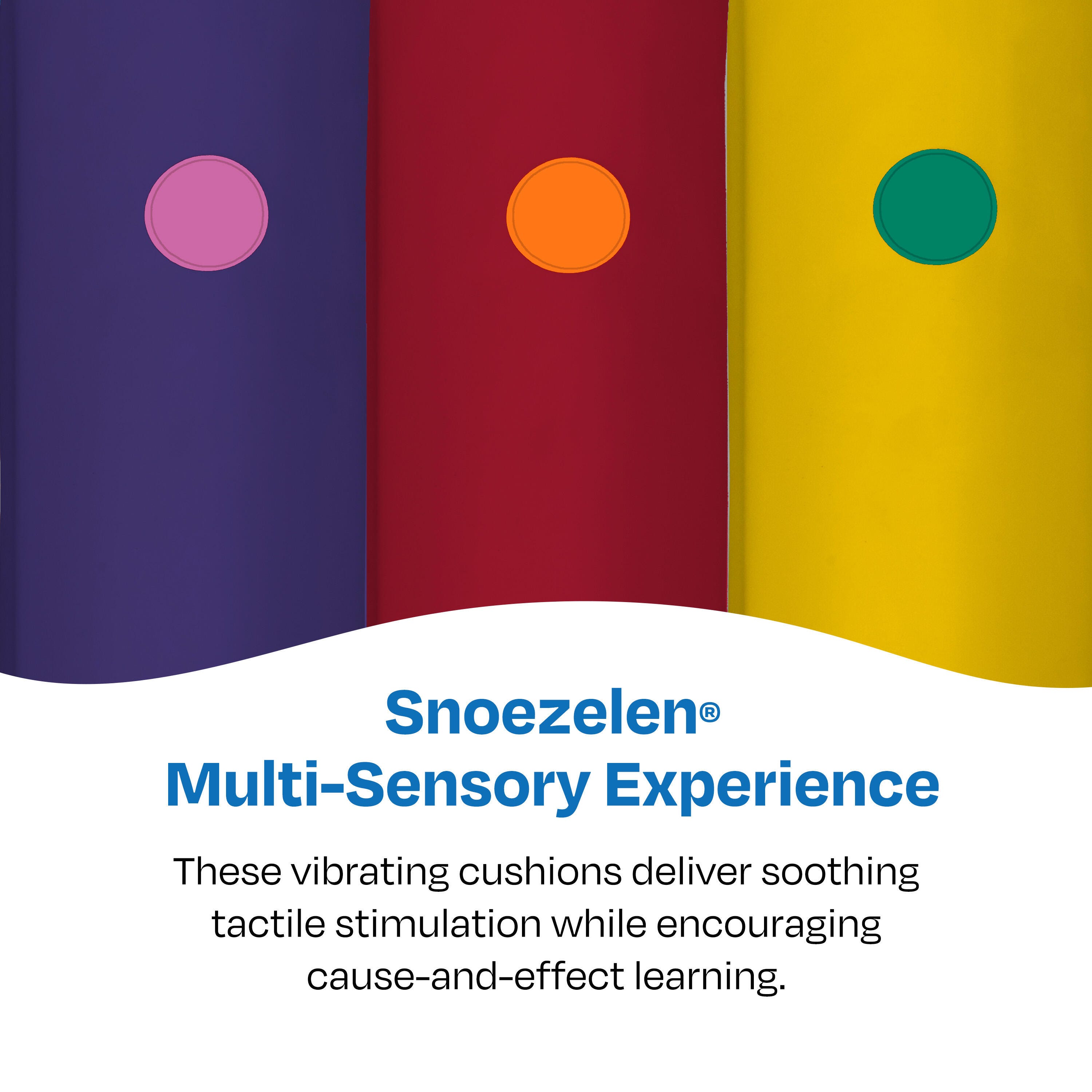 Snoezelen® Rainbow Bumpas with Vibration are designed to offer a soothing tactile experience, encouraging cause-and-effect learning and gross motor skills. Each cushion features two distinct vibration modules, clearly marked for easy interaction. Gentle vibrations provide calming sensory input, supporting sensory exploration. Built with durability in mind, these Bumpas are ideal for high-traffic environments such as therapy spaces, classrooms, and healthcare facilities. Their vibrant colors add an engaging visual element to any sensory room setup. Simply press the designated areas to activate the vibration response. Available in an assortment of bright colors. View the product brochure.