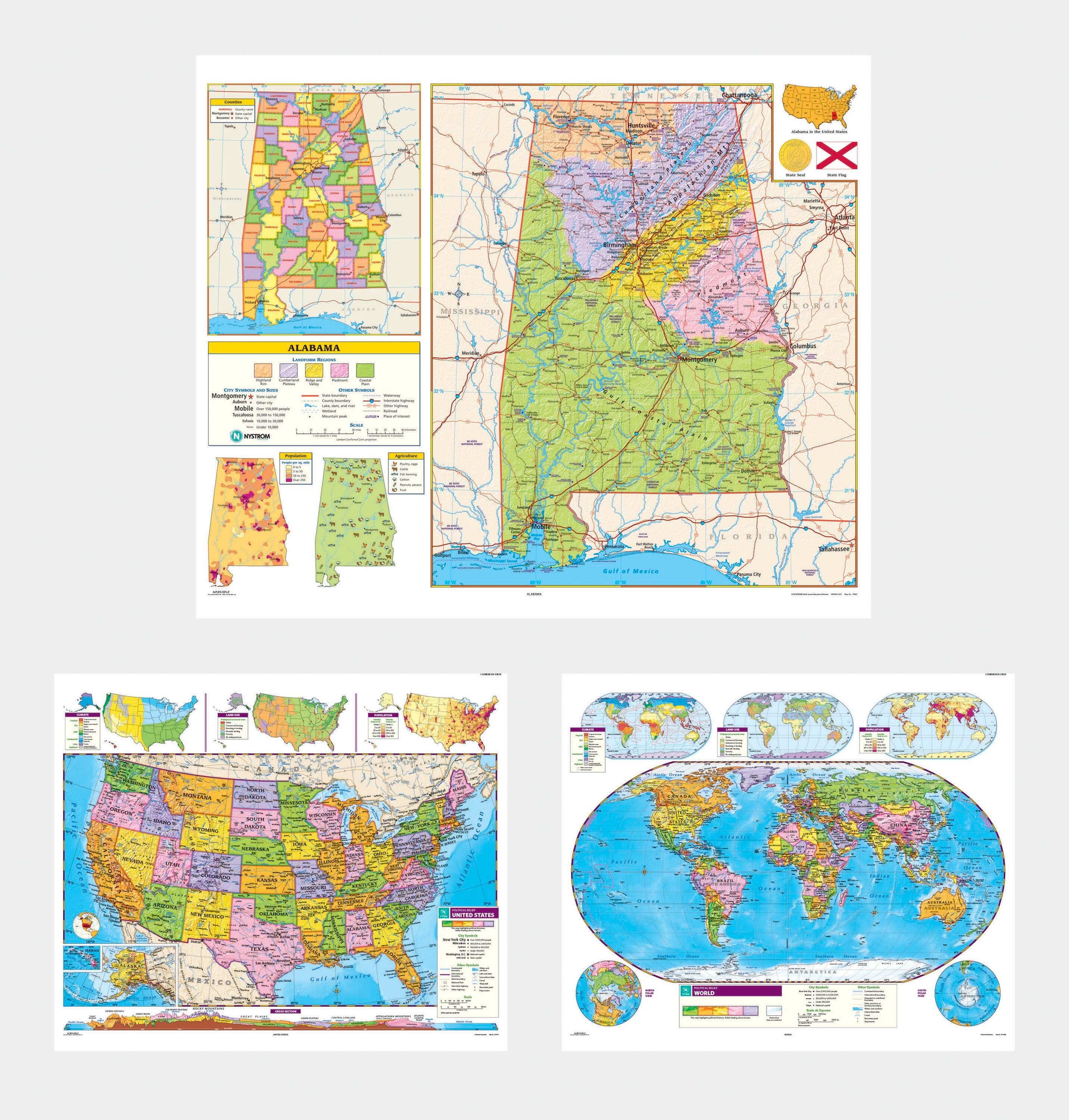 Social Studies ALABAMA/U.S./WORLD MAP COMBO, Markable, Erasable, Grades 4-12