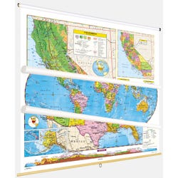 This large, colorful three-map set, mounted on a single roller, includes a state map, world map and United States map and is easy to read from across the room. The World and U.S. maps are political relief, with contrasting colors making countries and U.S. states immediately visible. The state map includes inset graphs and/or thematic maps providing information important to your state. The map set must be attached to the wall by means of a map rail or map rack (not included). Markable/erasable with water-soluble ink. Grades 4-12. Maps are 53 in H x 65 in W. Hardware to mount map is sold separately (1301145 for 1 Inch Map Rail or 285553 for 4-Map Rack).Features
