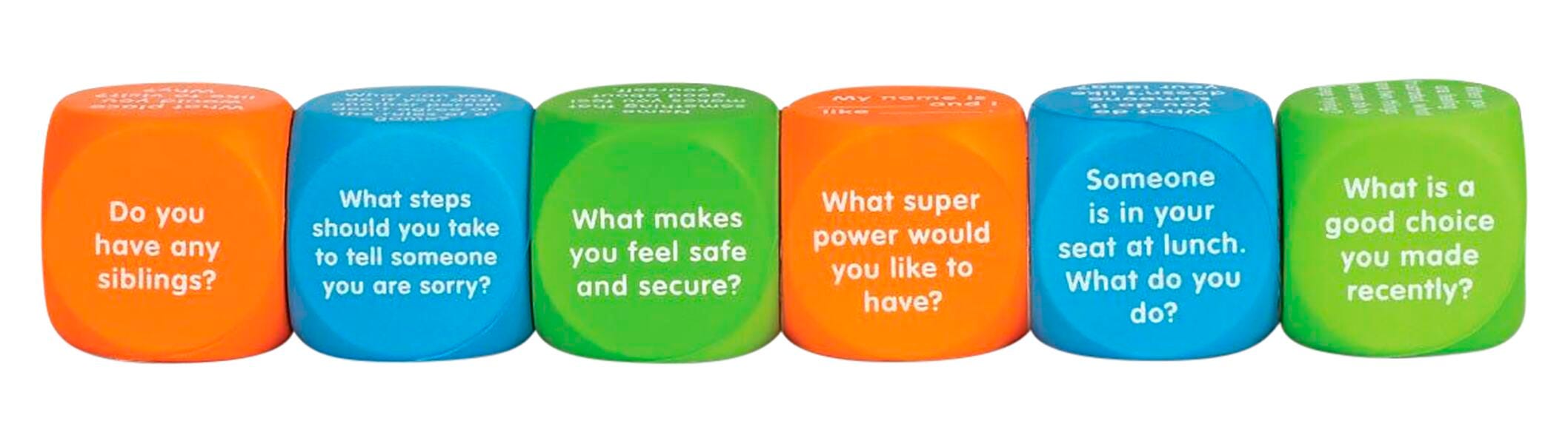 Social and emotional learning in action! This set of 6 colorful conversation cubes features engaging prompts targeting topics related to social-emotional learning (SEL). One-on-one or in small groups, kids and adults alike can take turns rolling the cubes and answering one of the 36 SEL questions and prompts printed on the sides. Let's Talk! Cubes come with three different SEL categories: roll an orange cube for Ice Breakers like "What holiday do you like best and why?"; roll a blue cube for Social Skills prompts like "What steps should you take to tell someone you are sorry?"; or roll a green cube for Emotional/Feeling prompts like "Name a time when you learned from your mistake." Each of the Let's Talk! Cubes are made from durable plastic that's ready for years of social-emotional learning activities. Appropriate for ages 5 years and up.Features