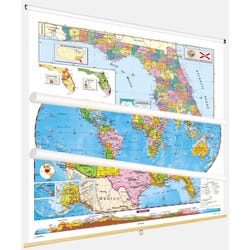 This large, colorful three-map set, mounted on a single roller, includes a state map, world map and United States map and is easy to read from across the room. The World and U.S. maps are political relief, with contrasting colors making countries and U.S. states immediately visible. The state map includes inset graphs and/or thematic maps providing information important to your state. The map set must be attached to the wall by means of a map rail or map rack (not included). Markable/erasable with water-soluble ink. Grades 4-12. Maps are 53 in H x 65 in W. Hardware to mount map is sold separately (1301145 for 1 Inch Map Rail or 285553 for 4-Map Rack).Features
