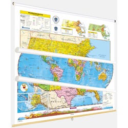This large, colorful three-map set, mounted on a single roller, includes a state map, world map and United States map and is easy to read from across the room. The World and U.S. maps are political relief, with contrasting colors making countries and U.S. states immediately visible. The state map includes inset graphs and/or thematic maps providing information important to your state. The map set must be attached to the wall by means of a map rail or map rack (not included). Markable/erasable with water-soluble ink. Grades 4-12. Maps are 53 in H x 65 in W. Hardware to mount map is sold separately (1301145 for 1 Inch Map Rail or 285553 for 4-Map Rack).Features