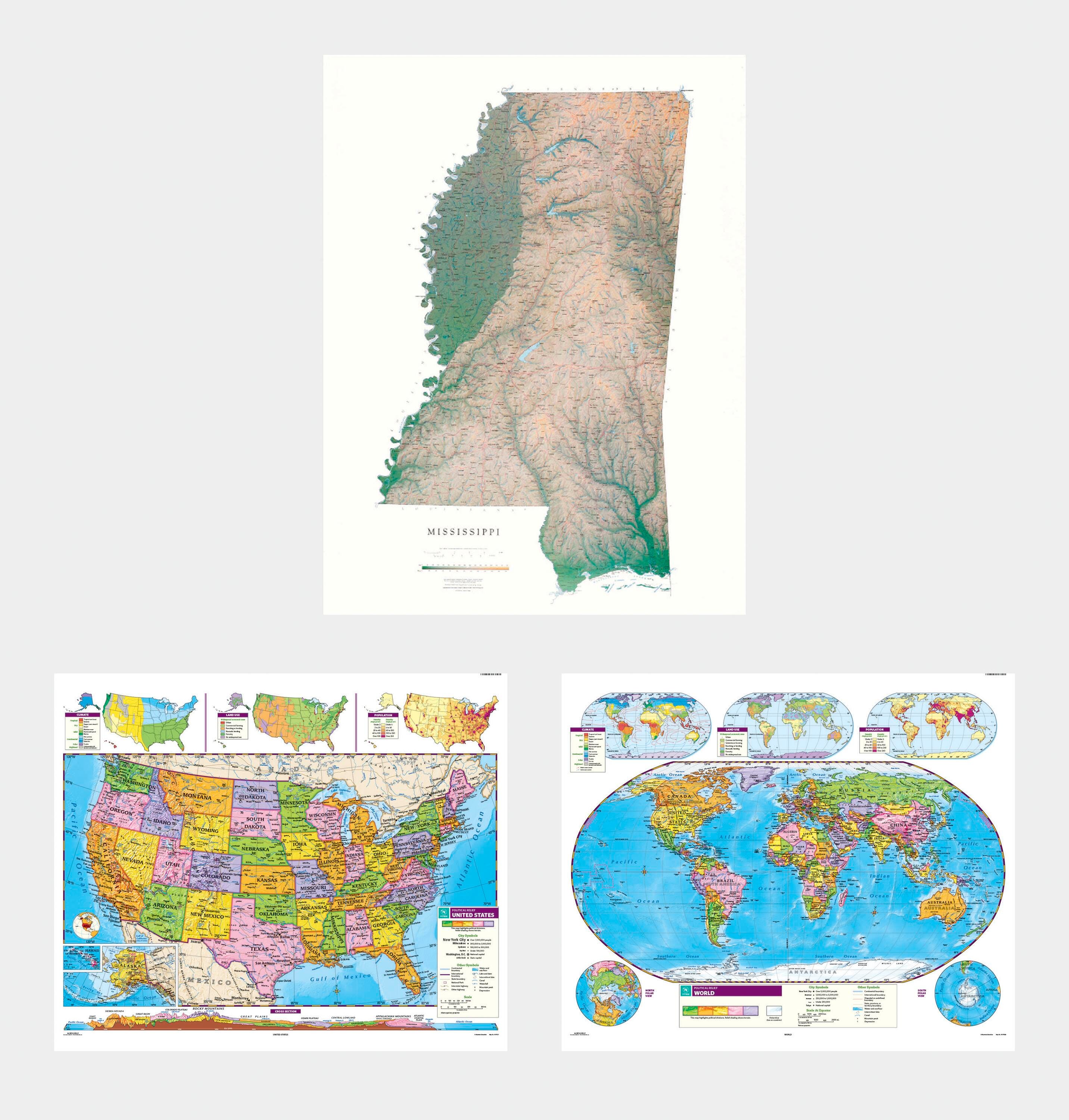 Social Studies MISSISSIPPI/U.S./WORLD MAP COMBO, Markable, Erasable, Grades 4-12