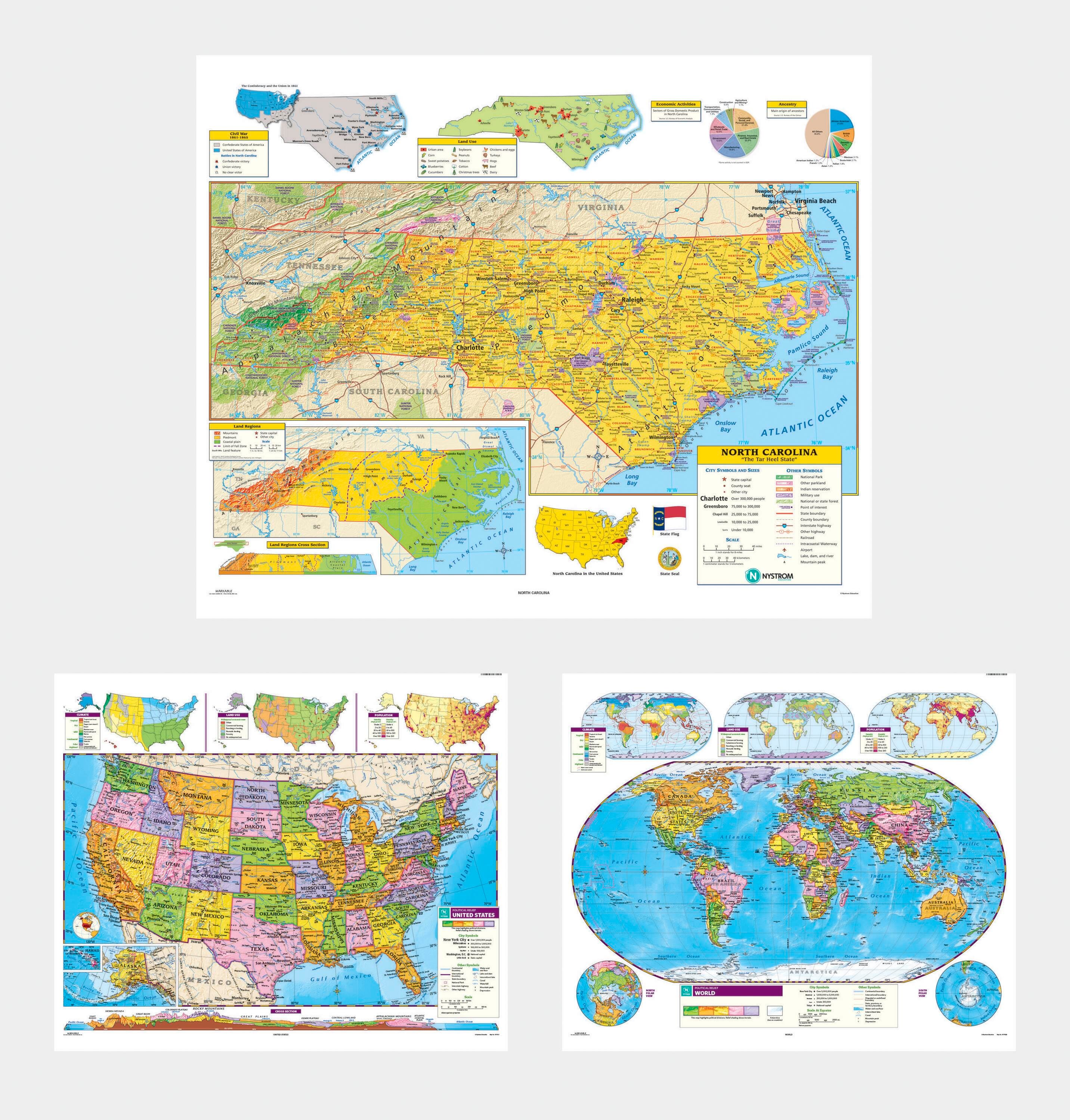 Social Studies NORTH CAROLINA/U.S./WORLD MAP COMBO, Markable, Erasable, Grades 4-12