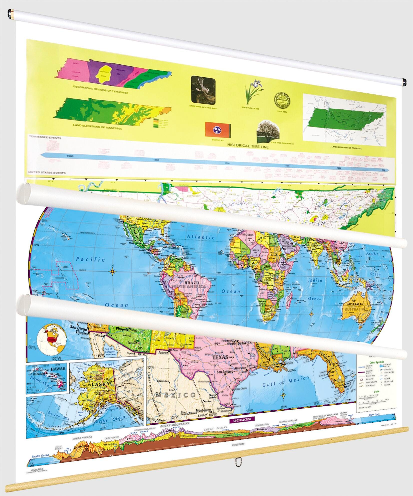 This large, colorful three-map set, mounted on a single roller, includes a state map, world map and United States map and is easy to read from across the room. The World and U.S. maps are political relief, with contrasting colors making countries and U.S. states immediately visible. The state map includes inset graphs and/or thematic maps providing information important to your state. The map set must be attached to the wall by means of a map rail or map rack (not included). Markable/erasable with water-soluble ink. Grades 4-12. Maps are 53 in H x 65 in W, Tennessee Map is 50 H X 68 in W. Hardware to mount map is sold separately (1301145 for 1 Inch Map Rail or 285553 for 4-Map Rack).Features