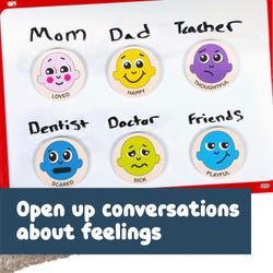 These Emotions Wooden Magnets from Spark & Wow help young children learn about emotions through play! These helpful magnets can inspire young children to explore mindfulness, emotions, and empathy by encouraging them to express their emotions and feelings with this hands-on resource. The magnets feature colorful and fun graphics that depict moods ranging from confident to embarrassed, sleepy to silly, and more. Arrange them on whiteboards and create unique social and emotional learning activities. Designed for ages 2 years and up. Each magnet has a diameter of 2-1/4 inches.Features