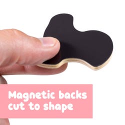 - For spaces where choke hazards are a concern, magnetic backs on the pieces are cut to shape and glued on, which means no small magnets can be lost