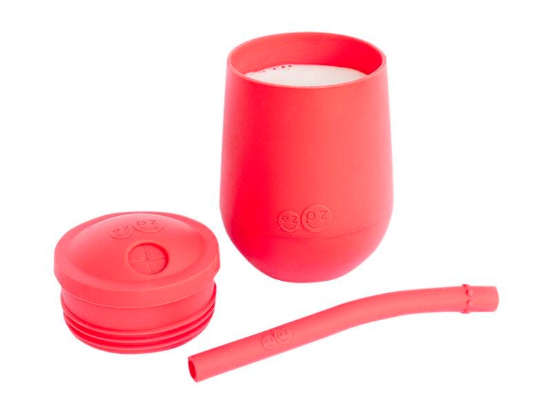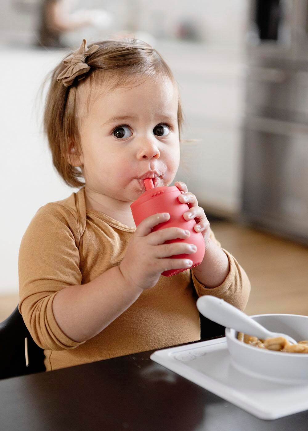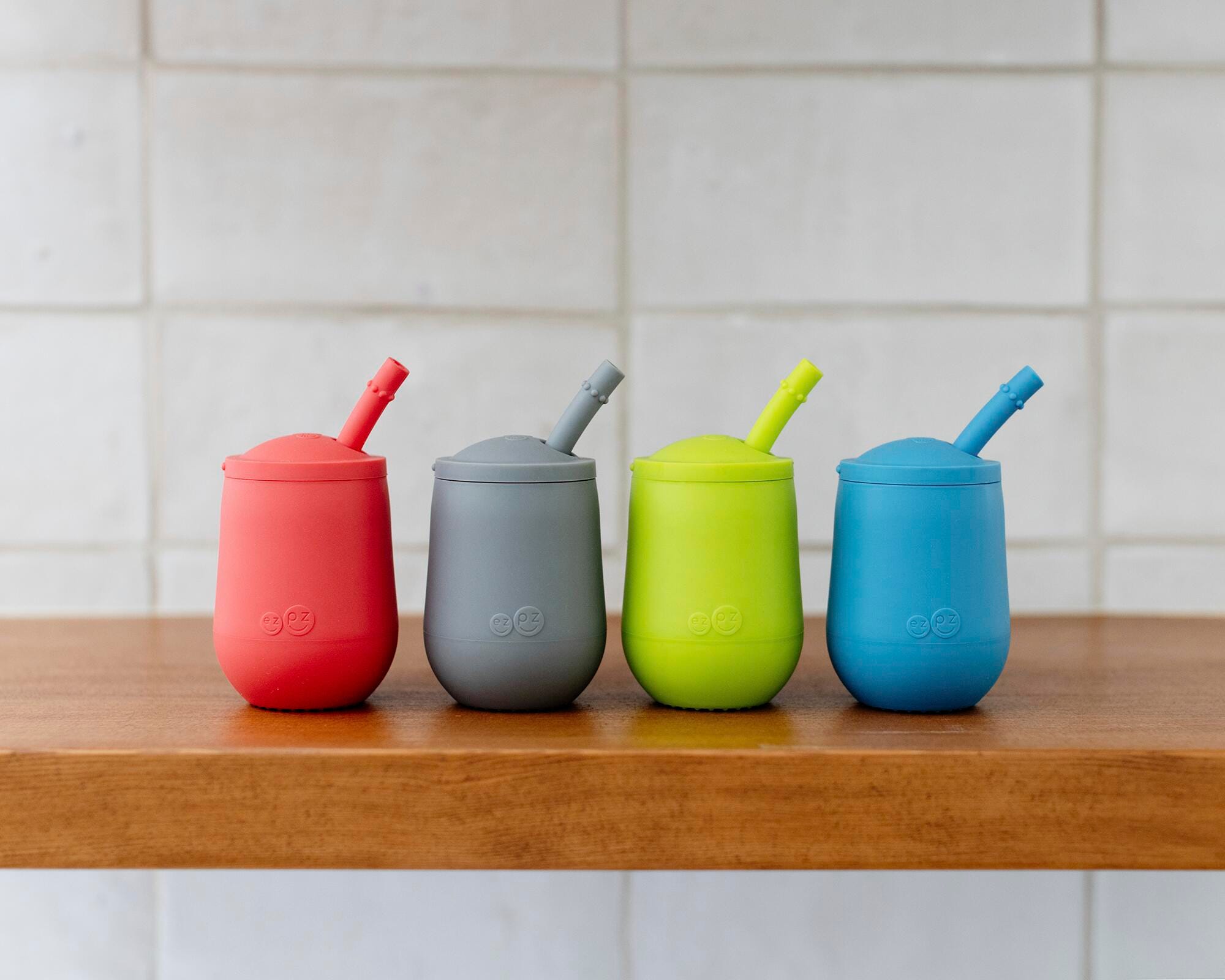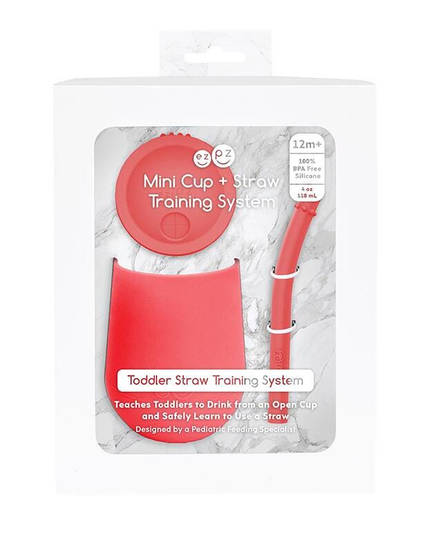 Learning to drink from a straw is an important developmental milestone that develops lip rounding and promotes speech development. The ezpz Mini Cup + Straw Training System teaches toddlers to drink from an open cup and safely learn to use a straw.