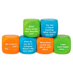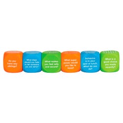 Social and emotional learning in action! This set of 6 colorful conversation cubes features engaging prompts targeting topics related to social-emotional learning (SEL). One-on-one or in small groups, kids and adults alike can take turns rolling the cubes and answering one of the 36 SEL questions and prompts printed on the sides. Let's Talk! Cubes come with three different SEL categories: roll an orange cube for Ice Breakers like "What holiday do you like best and why?"; roll a blue cube for Social Skills prompts like "What steps should you take to tell someone you are sorry?"; or roll a green cube for Emotional/Feeling prompts like "Name a time when you learned from your mistake." Each of the Let's Talk! Cubes are made from durable plastic that's ready for years of social-emotional learning activities. Appropriate for ages 5 years and up.Features
