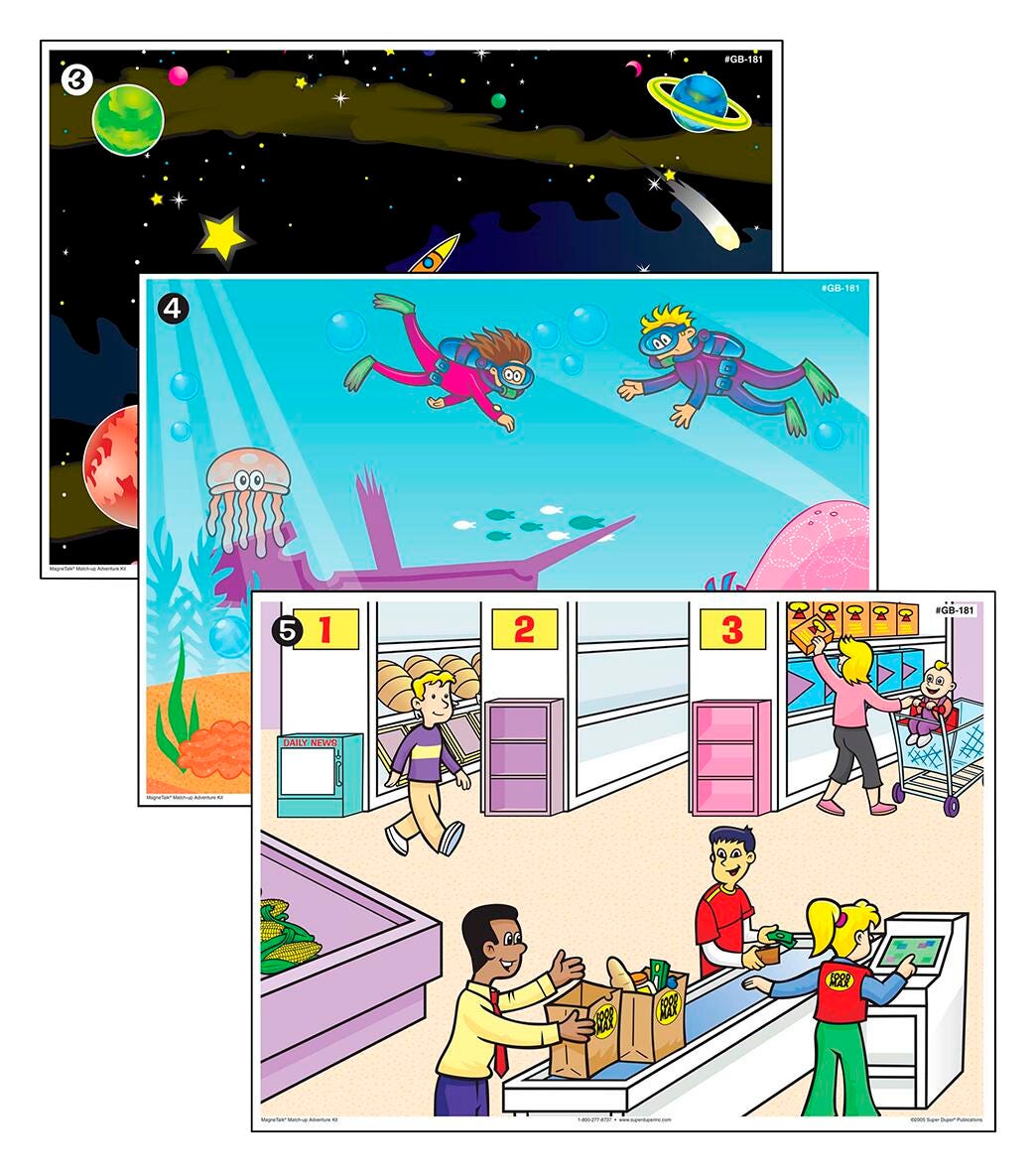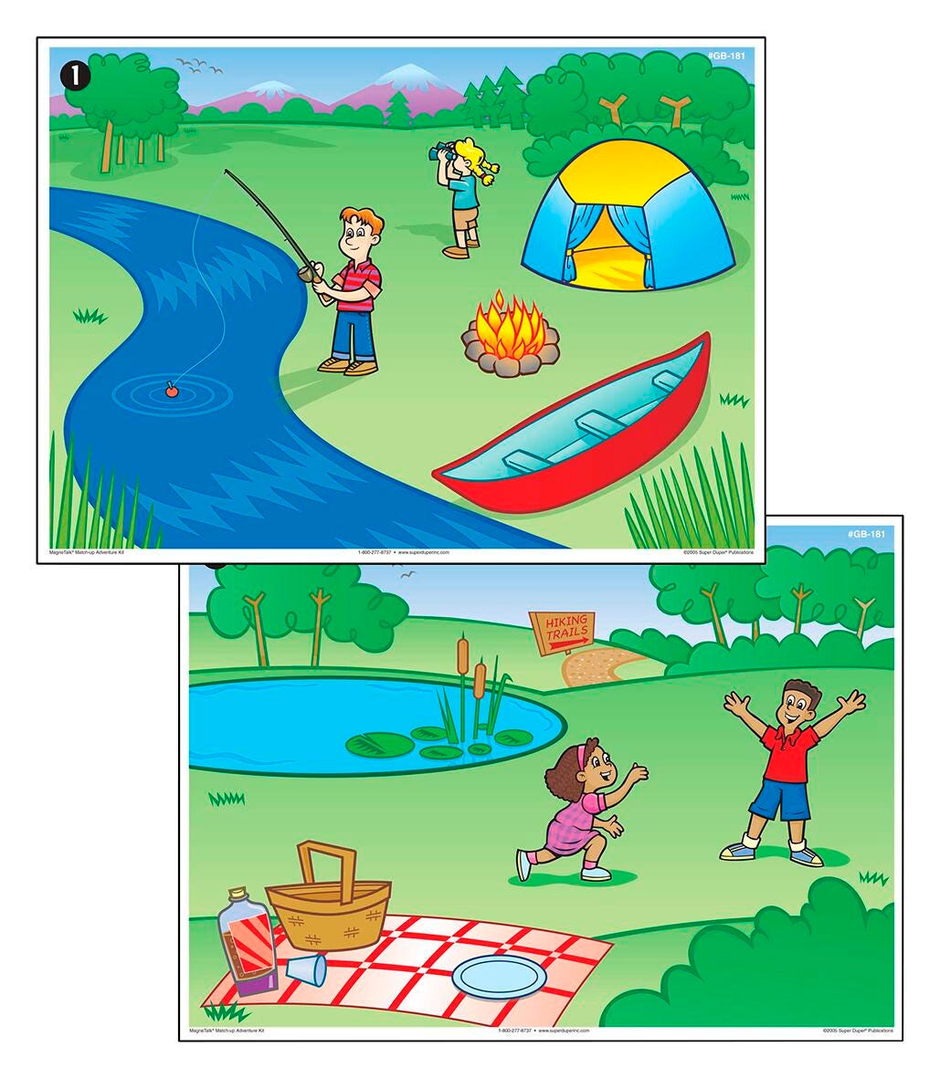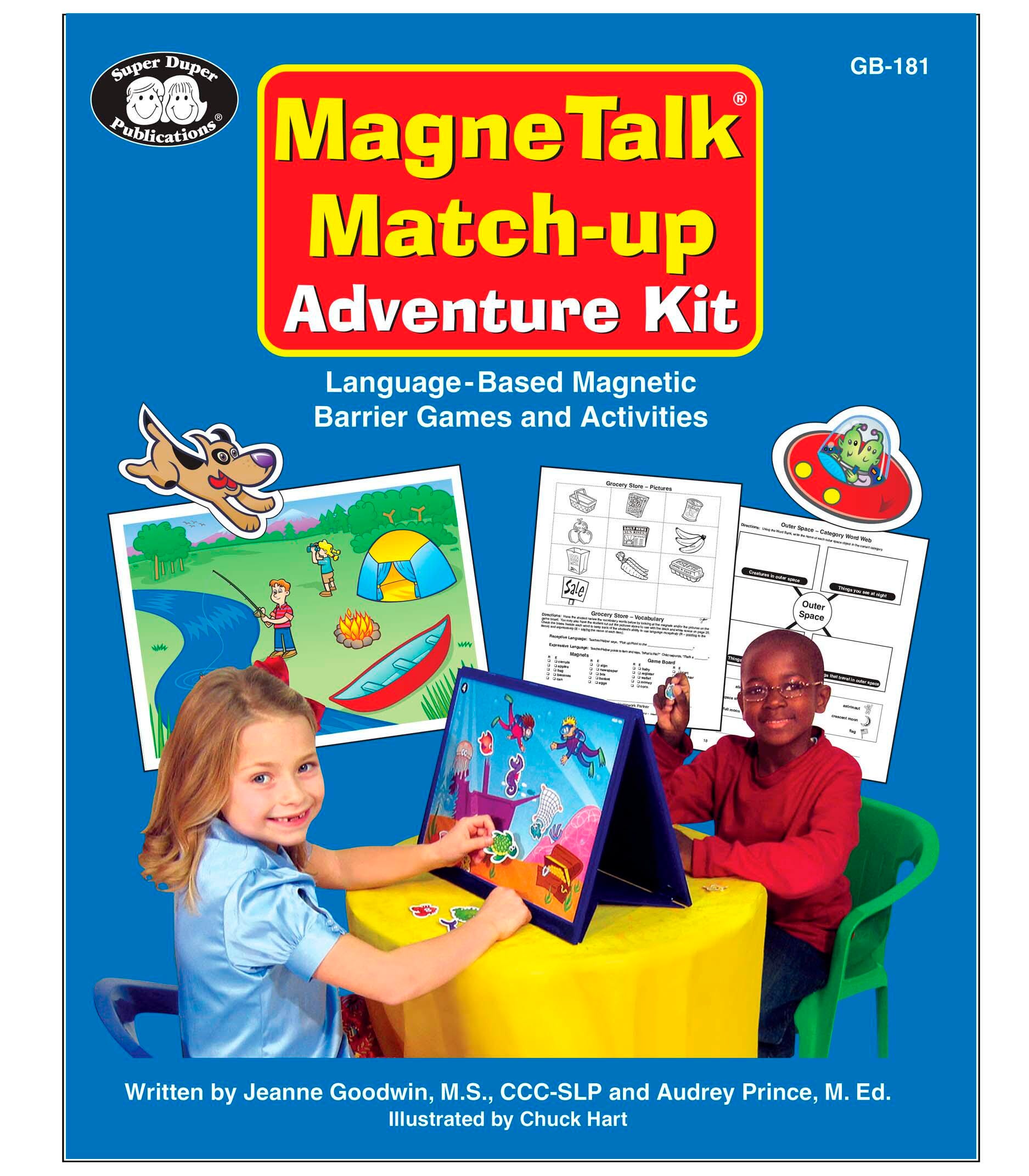 This one-of-a-kind, magnetic masterpiece targets a ton of language and listening skills. The barrier game format is perfect for following directions, deductive reasoning, giving directions, vocabulary, auditory memory, storytelling, basic concepts, categorization, rhyming, and listening. Your students will have a blast going camping, swimming through the ocean, and traveling to outer space while learning to listen and use language effectively. The kit includes a reproducible workbook to make homework and group activities a breeze.Features